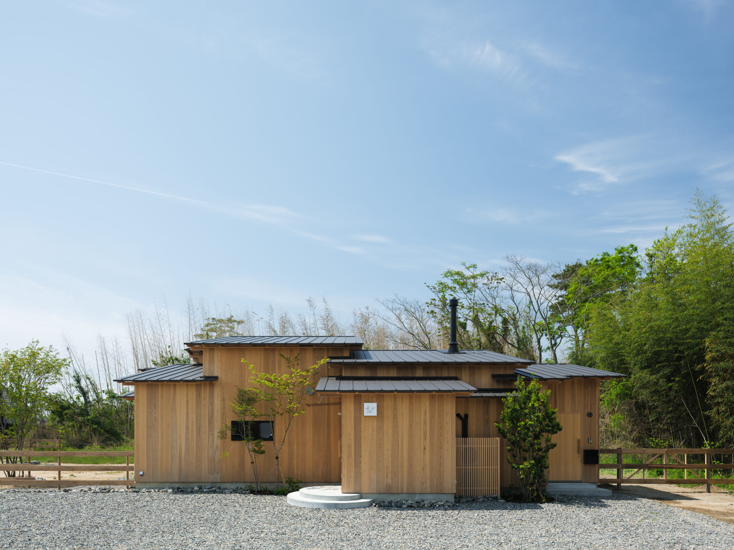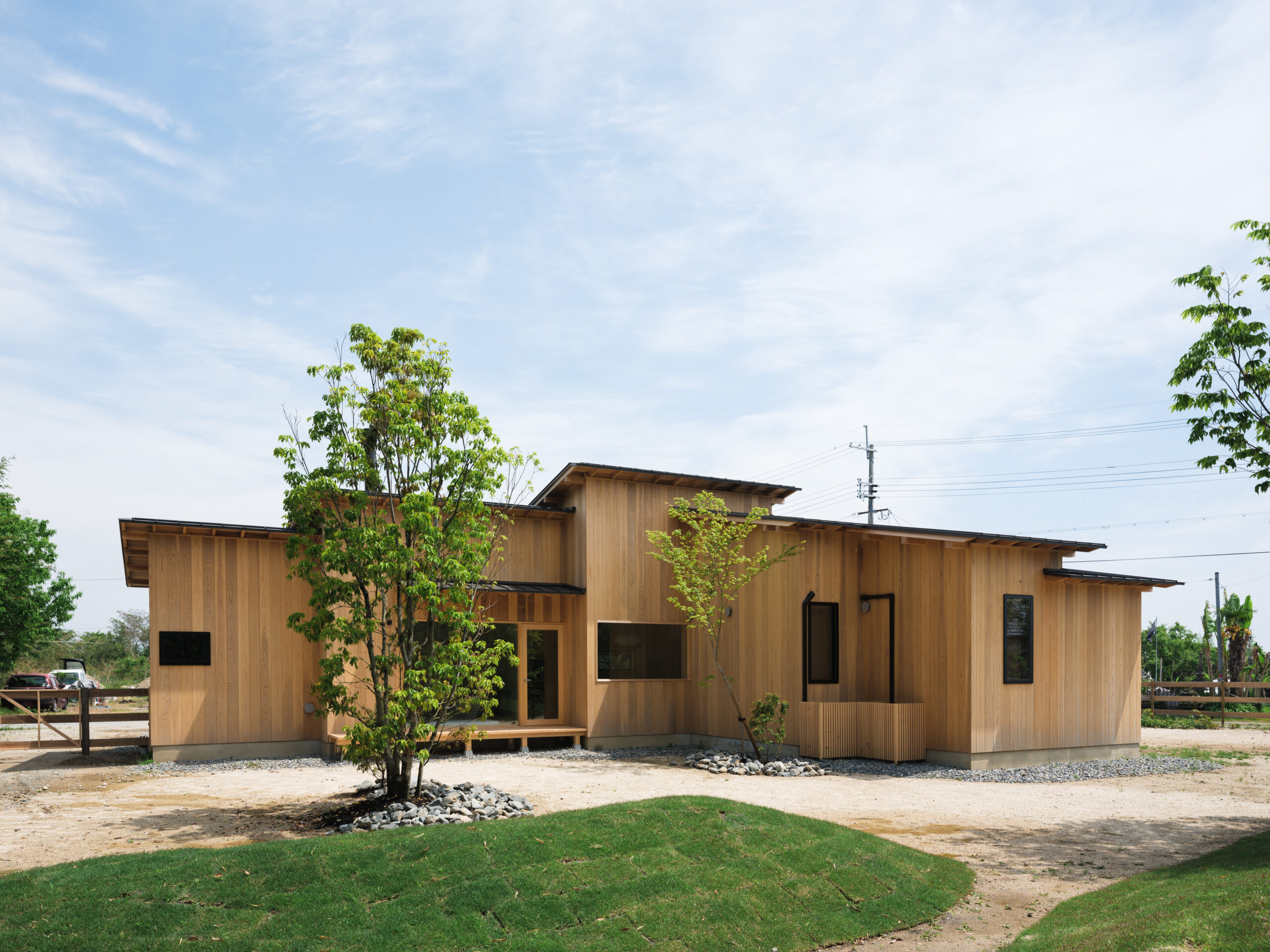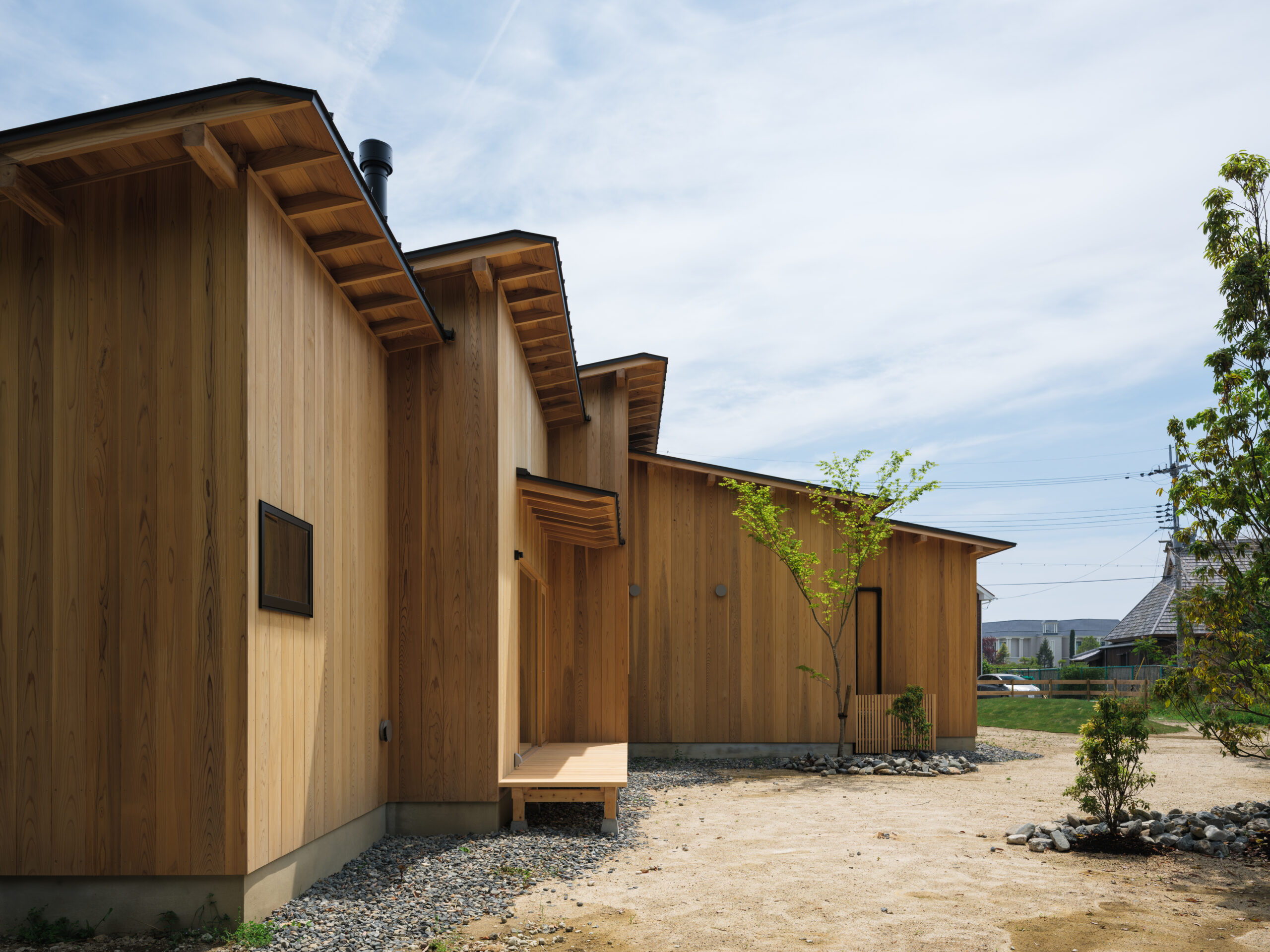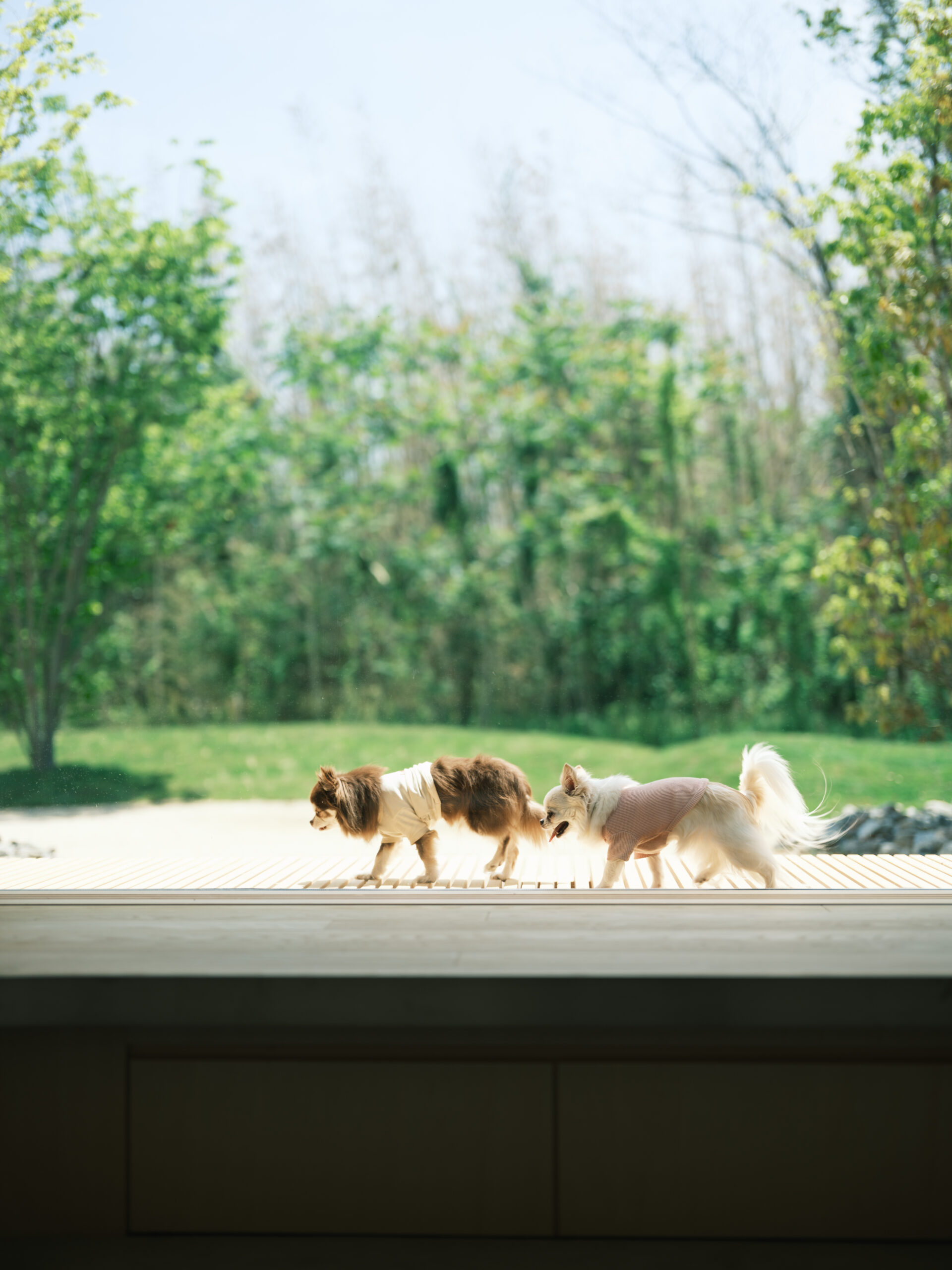 食を生業とする親子と2匹の犬が暮らす平屋建てを描いた。