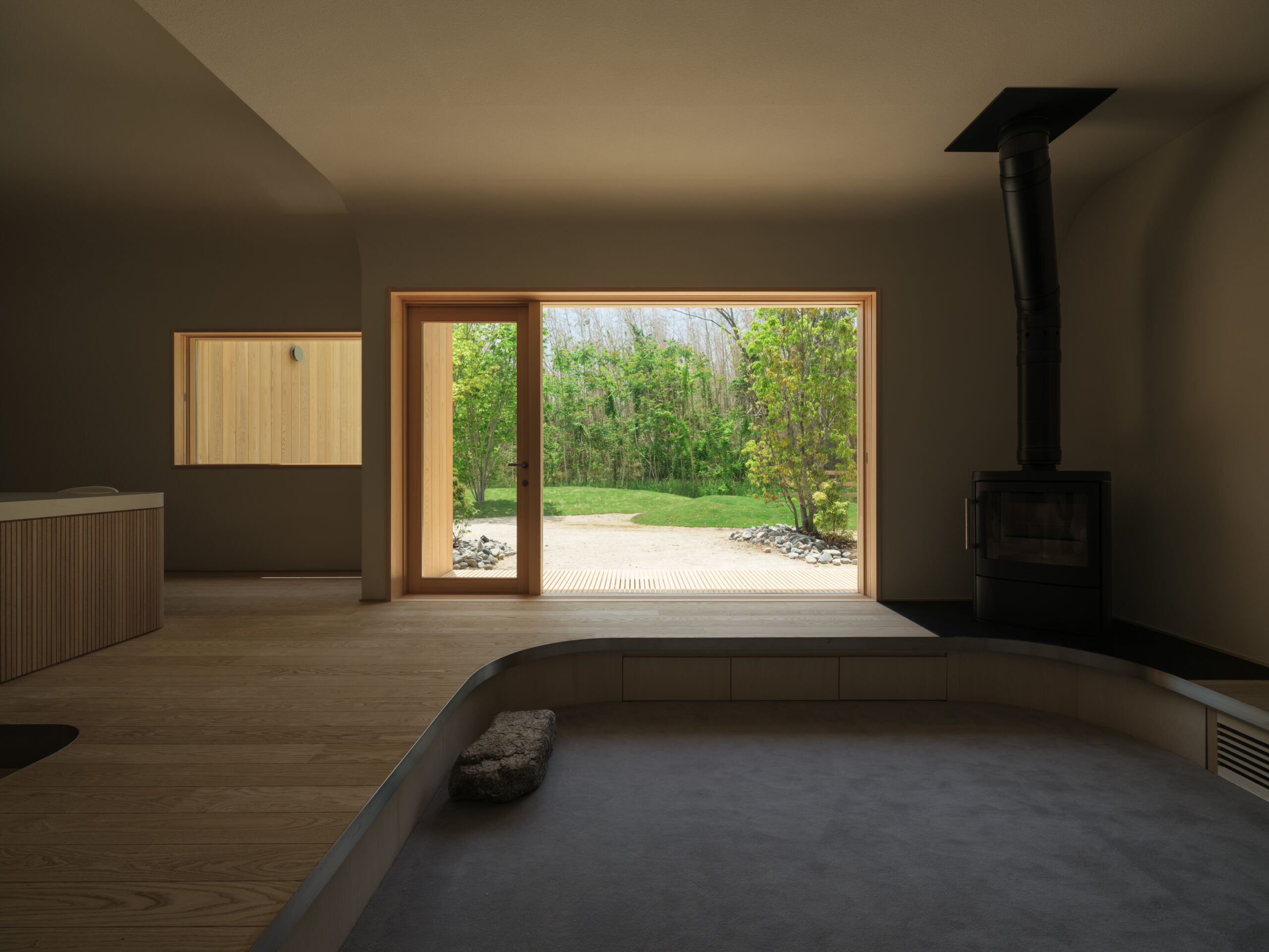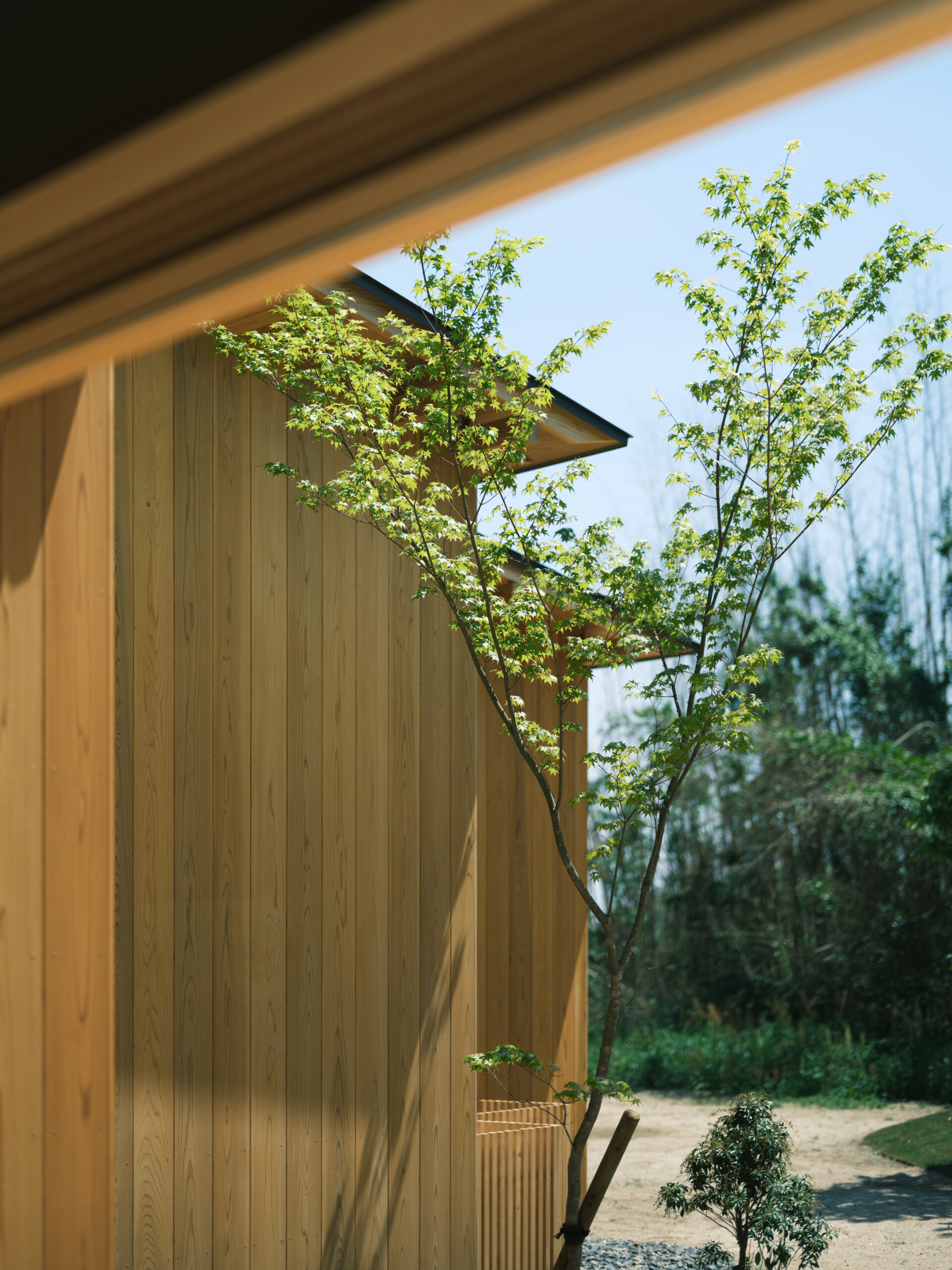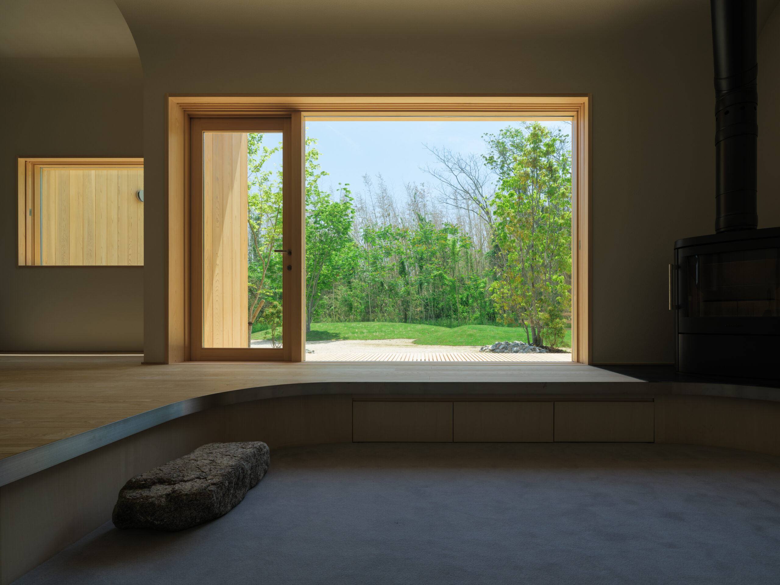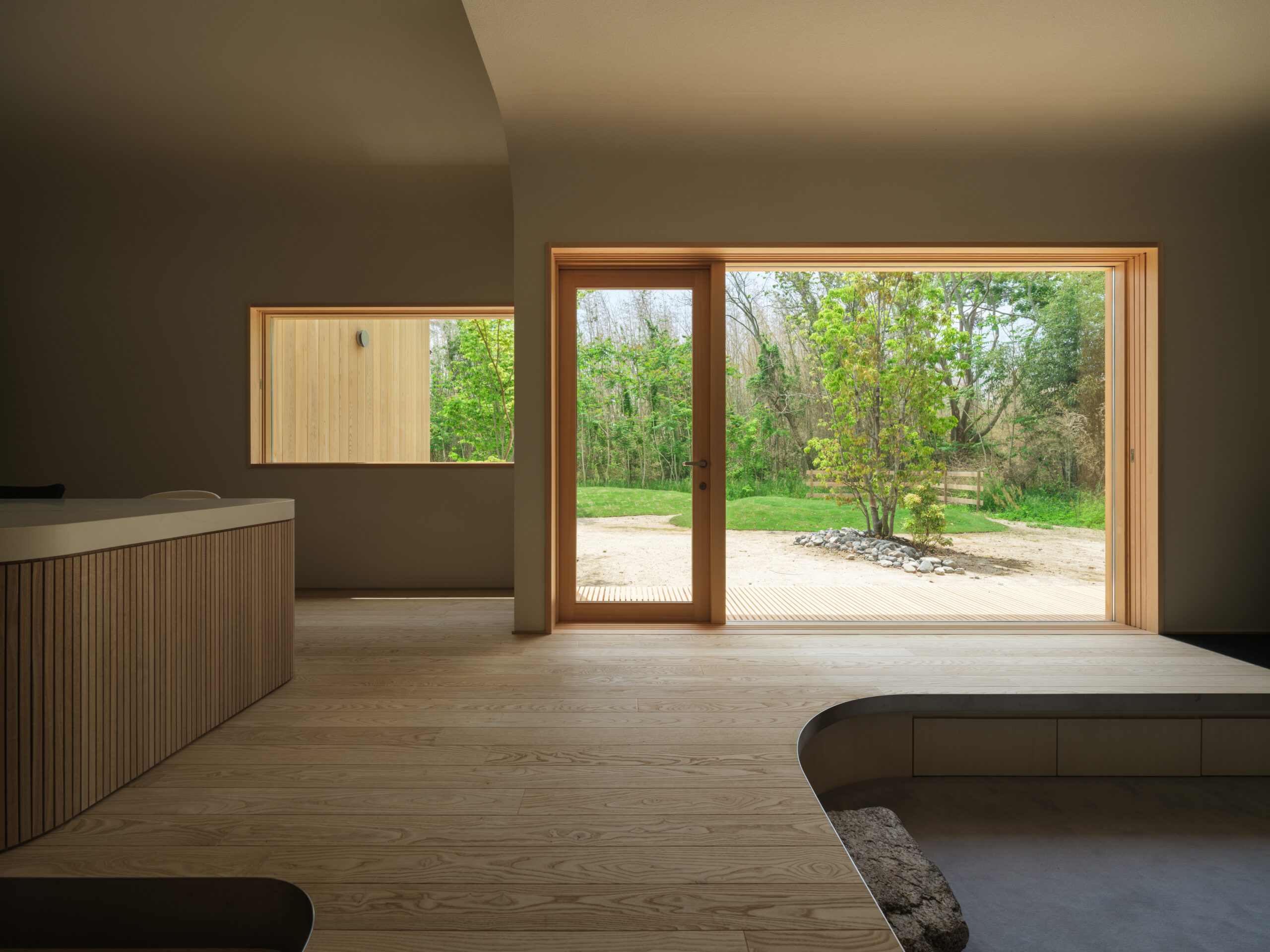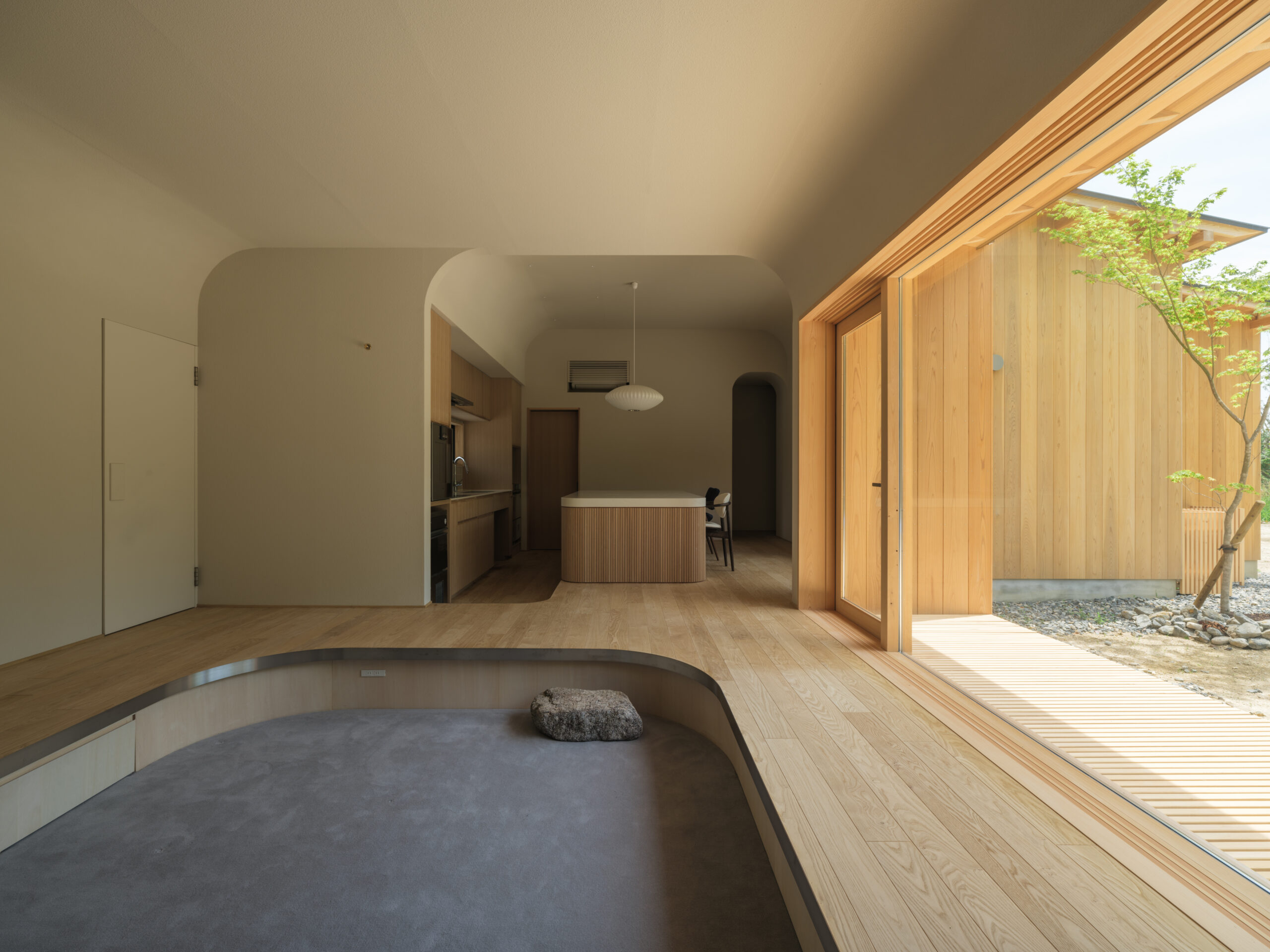 各要素の部屋を雁行させ、エントランスから奥に進むほど空間は徐々に閉じ、プライベートな空間になっていく計画として、外部との視線の抜けや奥行きの変化を与えている。また、それぞれの部屋の天井の高さを変え、柔らかなアールを連続させることで、木々の枝葉が下がる中を歩いていくような感覚を作った。