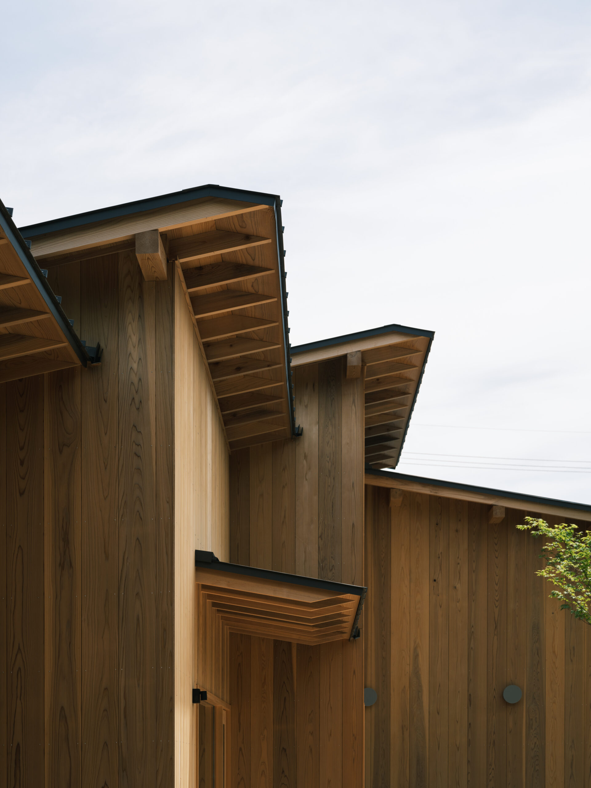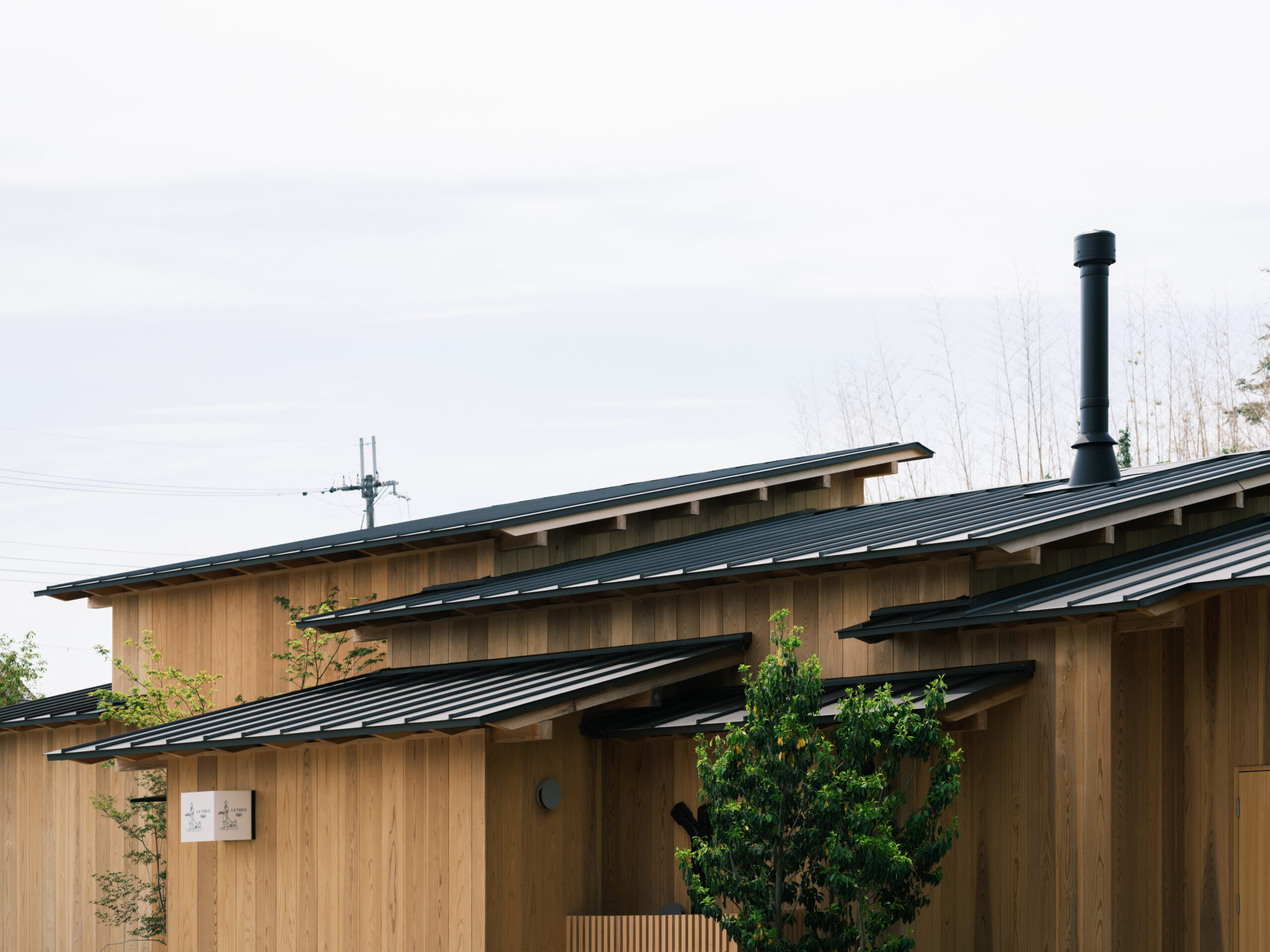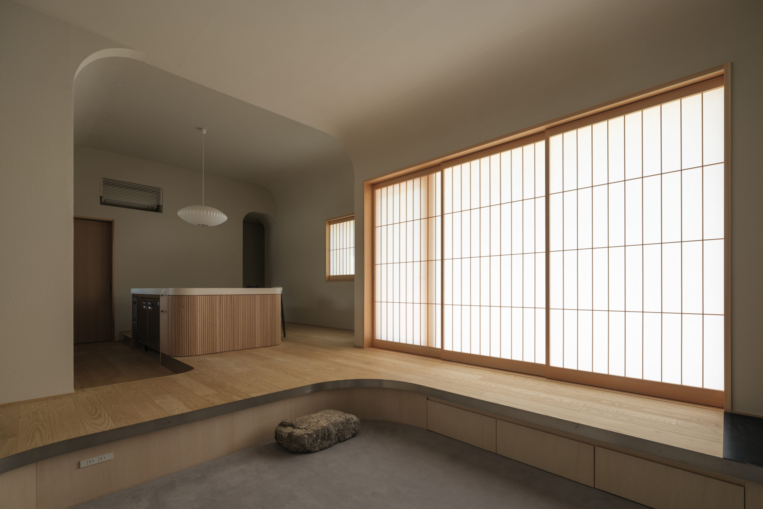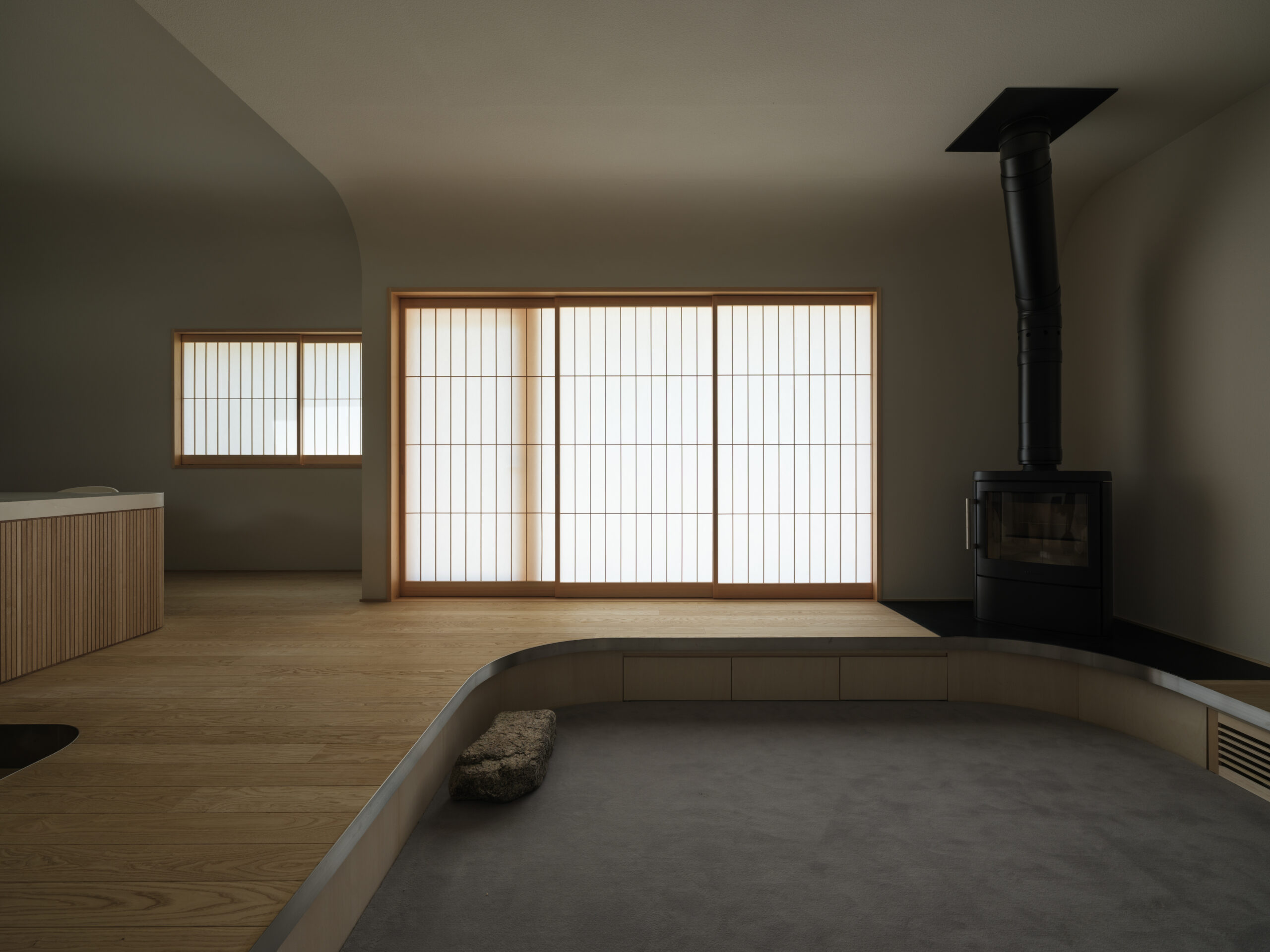 各要素の部屋を雁行させ、エントランスから奥に進むほど空間は徐々に閉じ、プライベートな空間になっていく計画として、外部との視線の抜けや奥行きの変化を与えている。また、それぞれの部屋の天井の高さを変え、柔らかなアールを連続させることで、木々の枝葉が下がる中を歩いていくような感覚を作った。