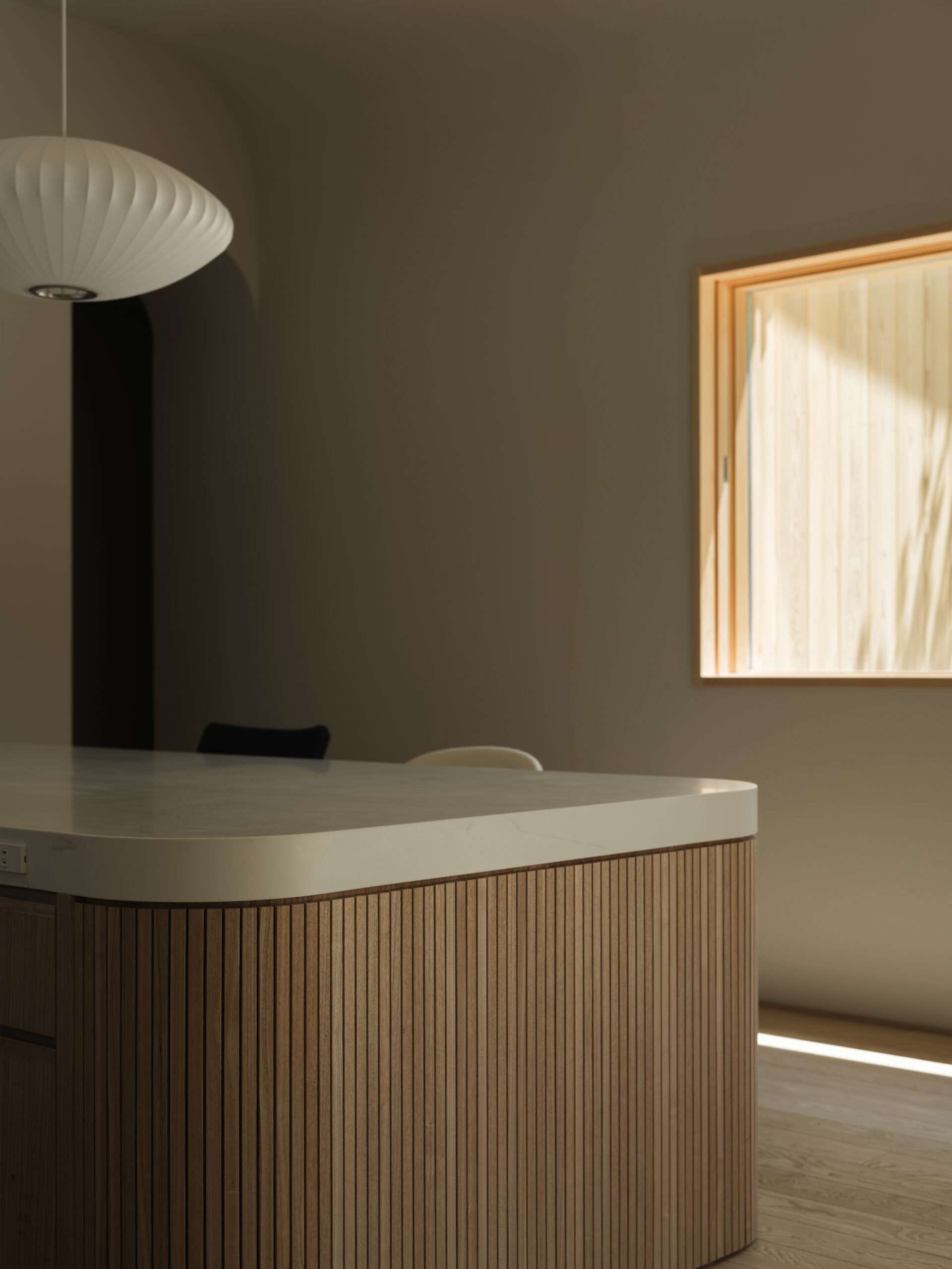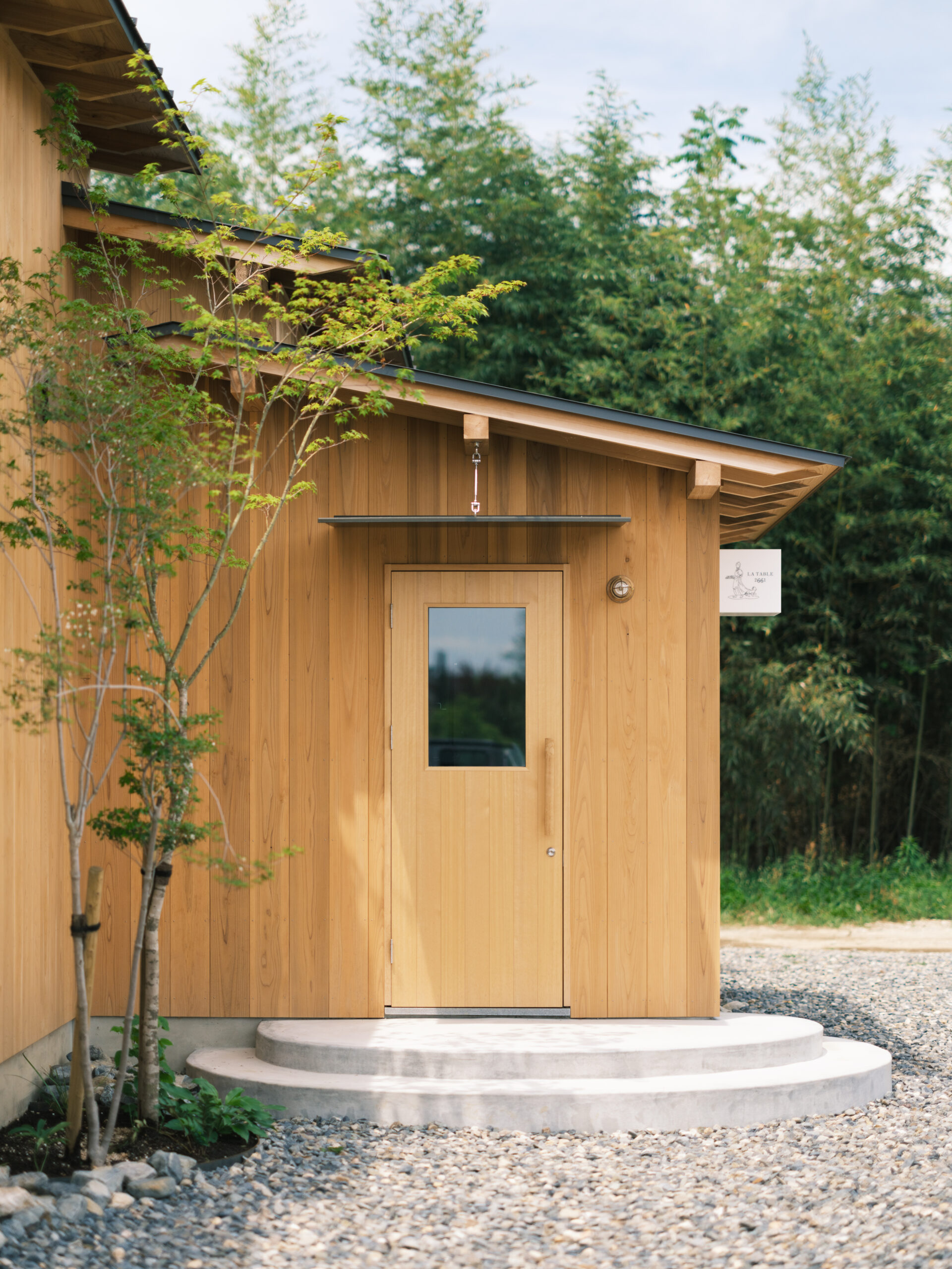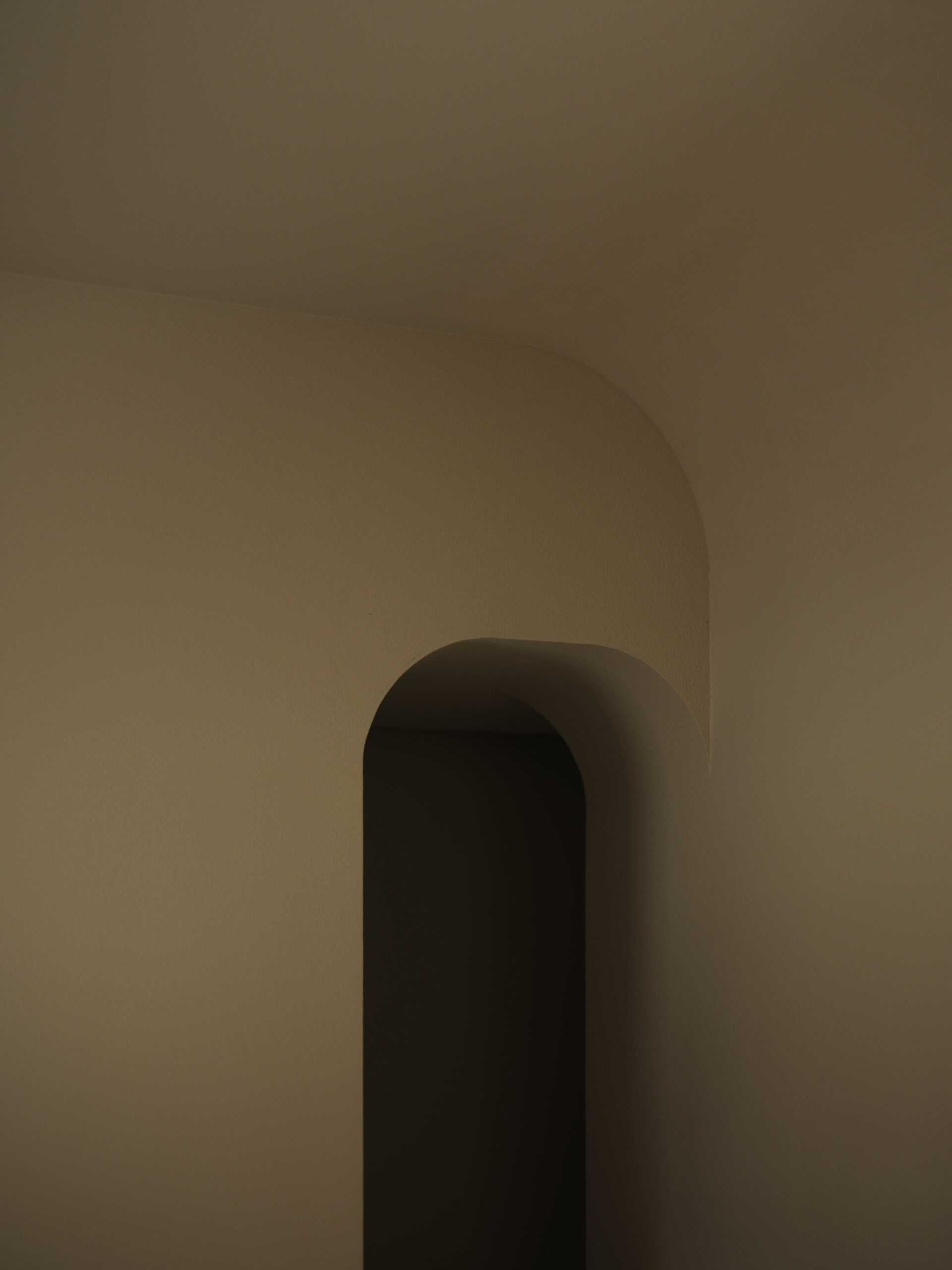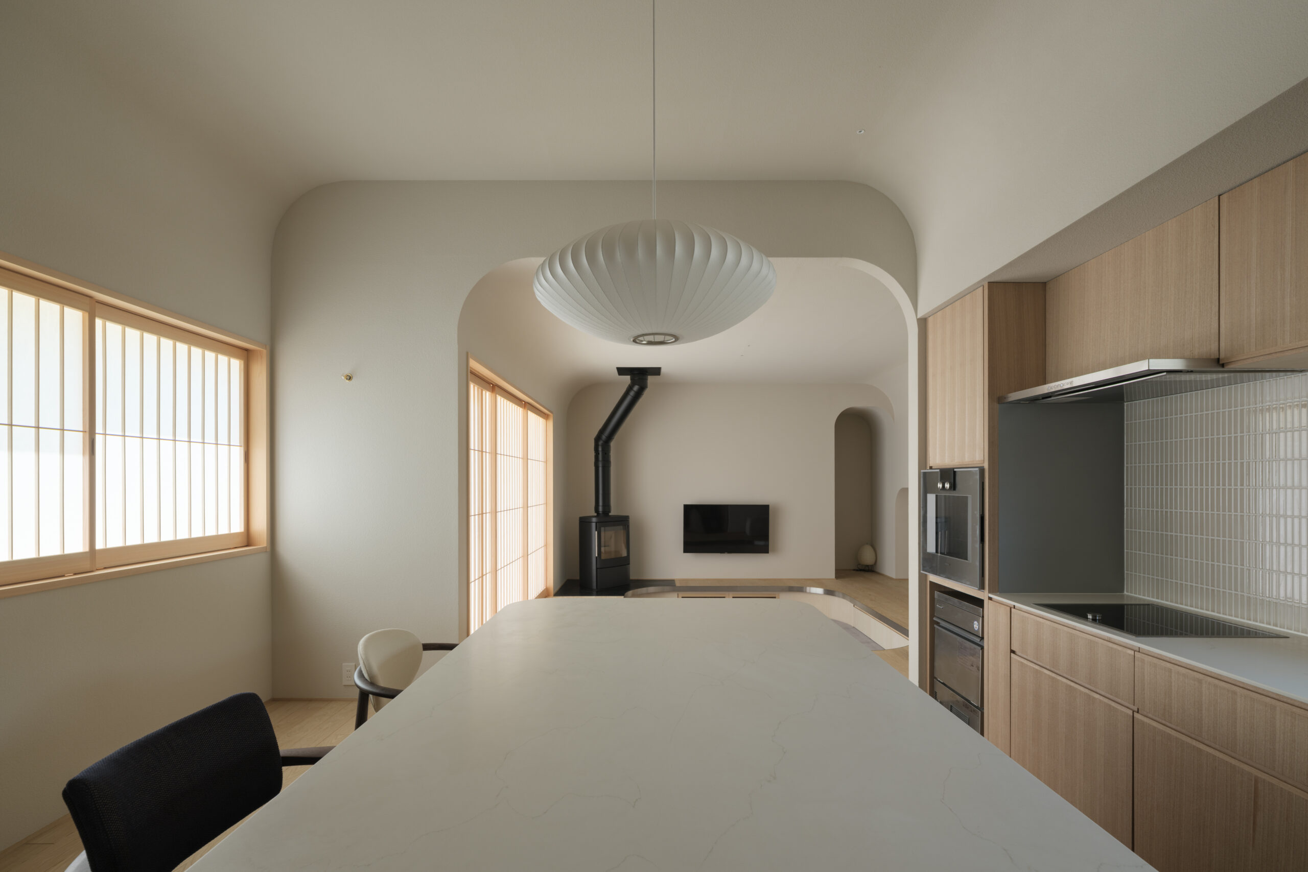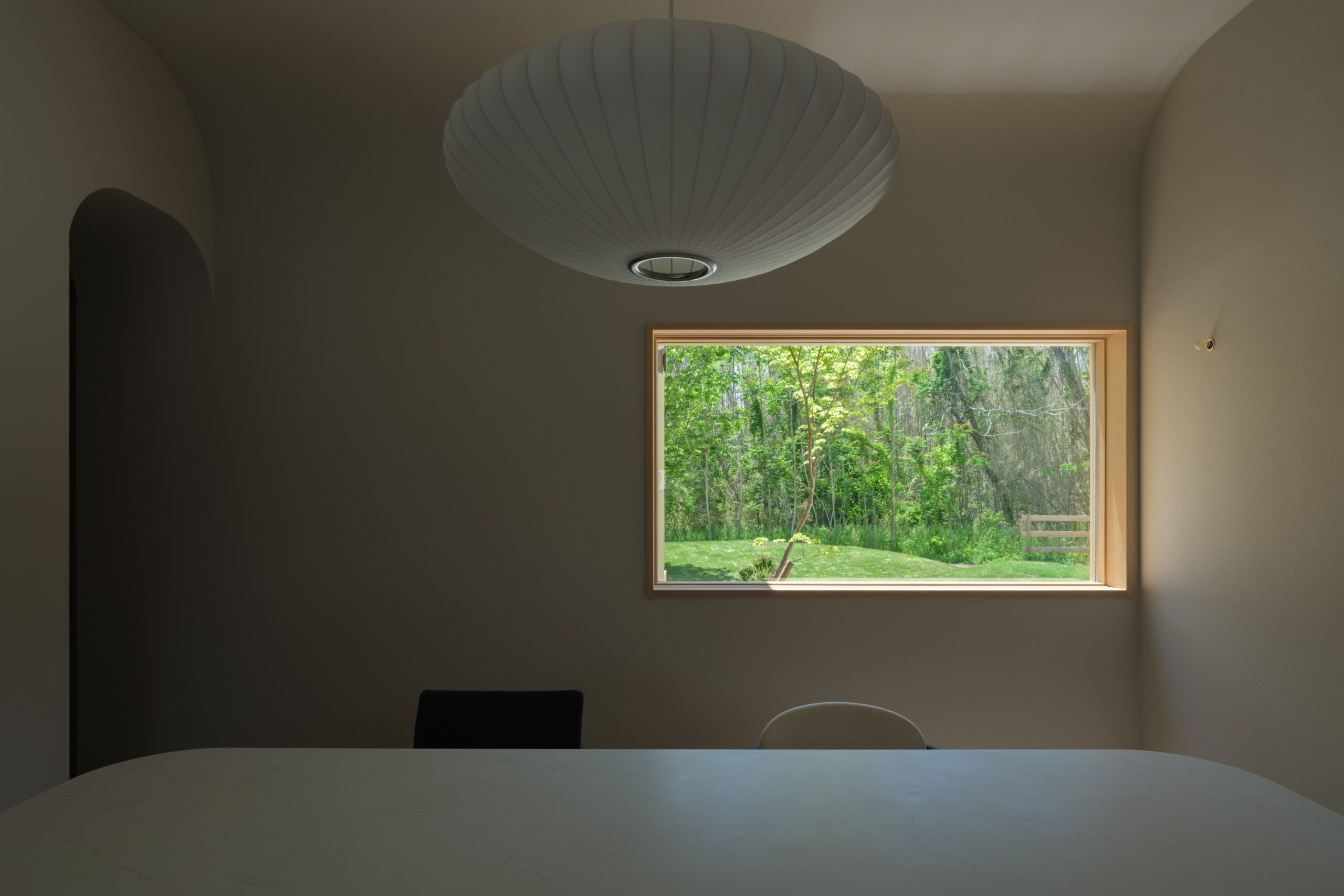 各要素の部屋を雁行させ、エントランスから奥に進むほど空間は徐々に閉じ、プライベートな空間になっていく計画として、外部との視線の抜けや奥行きの変化を与えている。また、それぞれの部屋の天井の高さを変え、柔らかなアールを連続させることで、木々の枝葉が下がる中を歩いていくような感覚を作った。