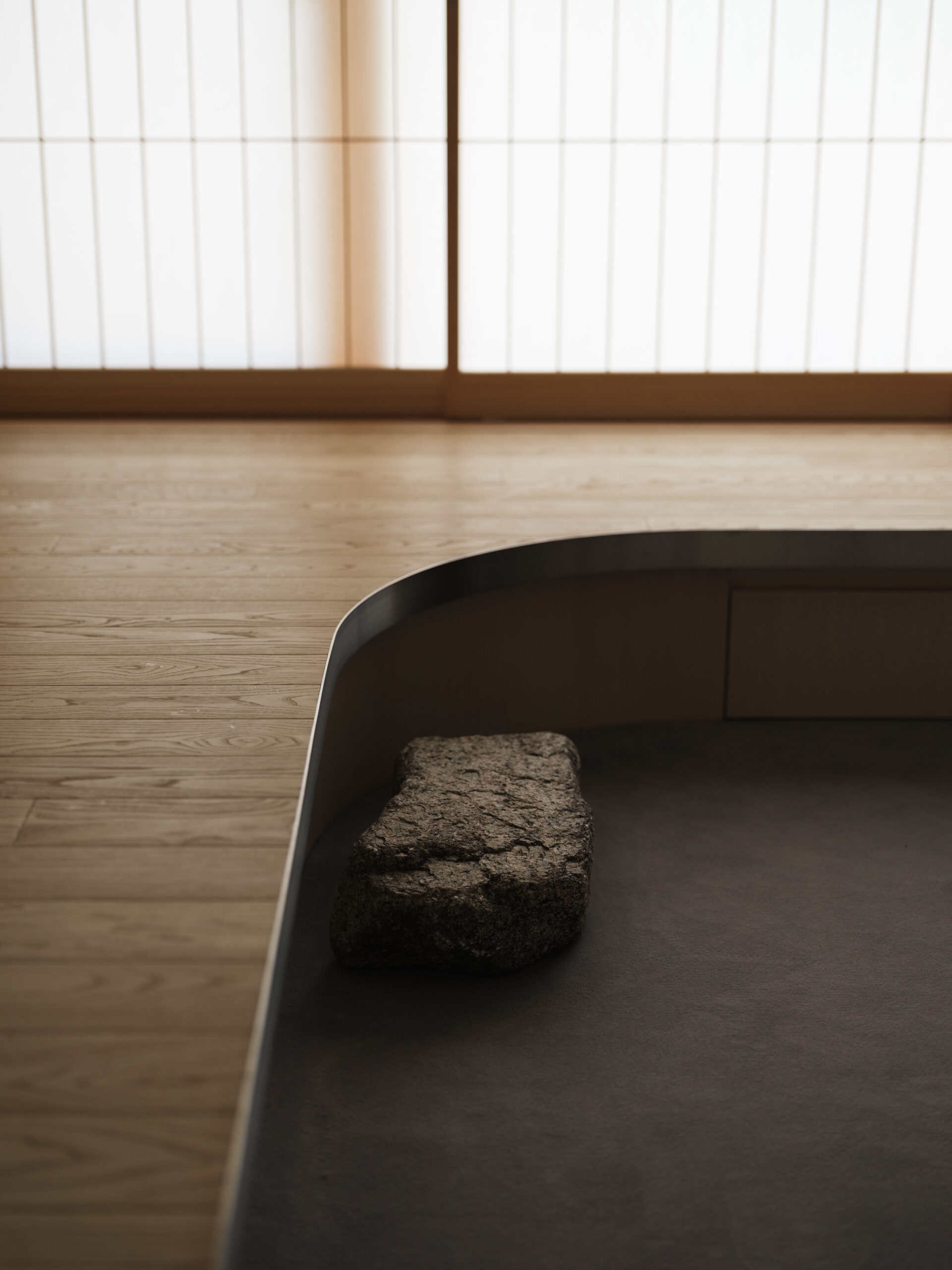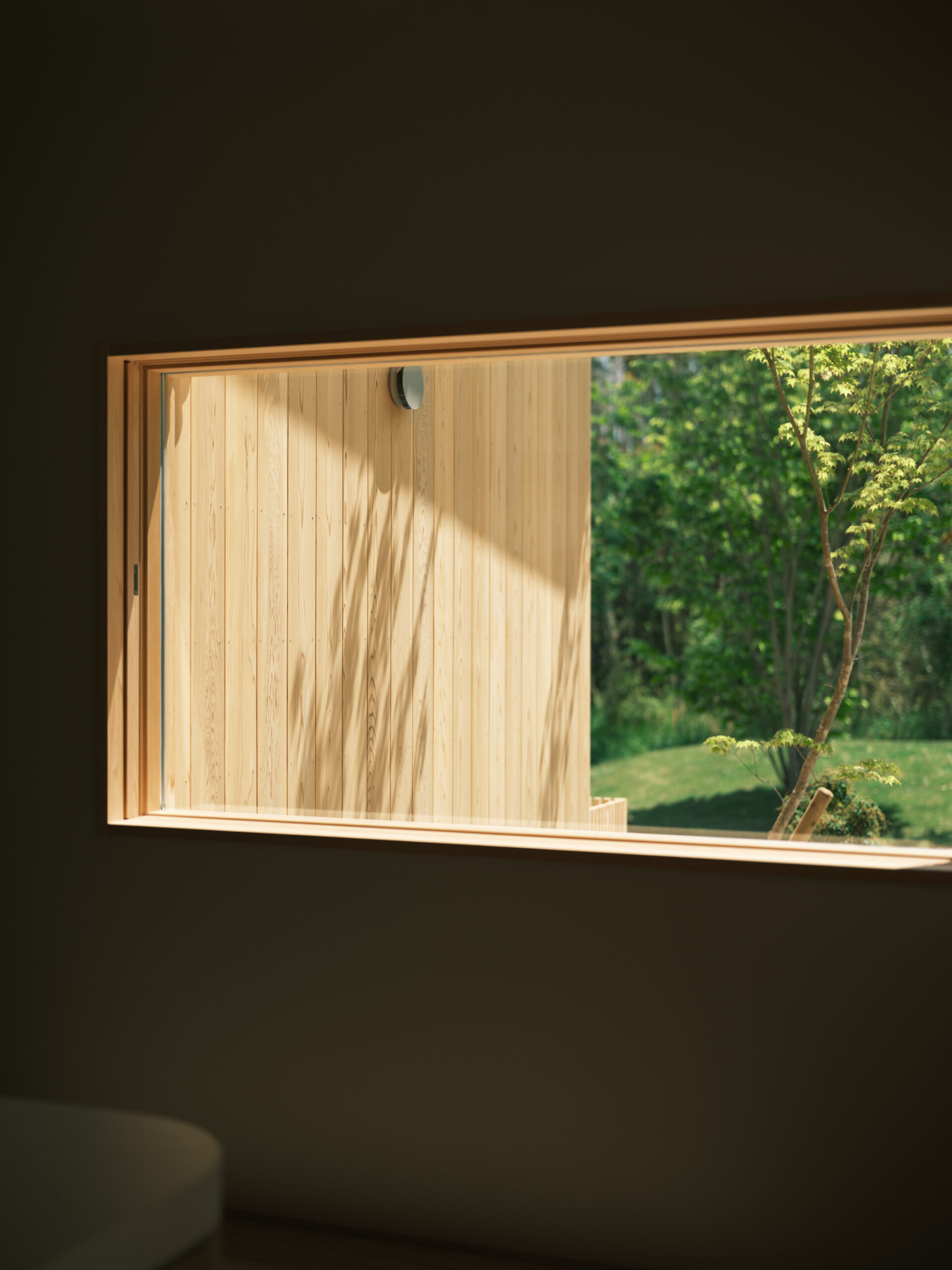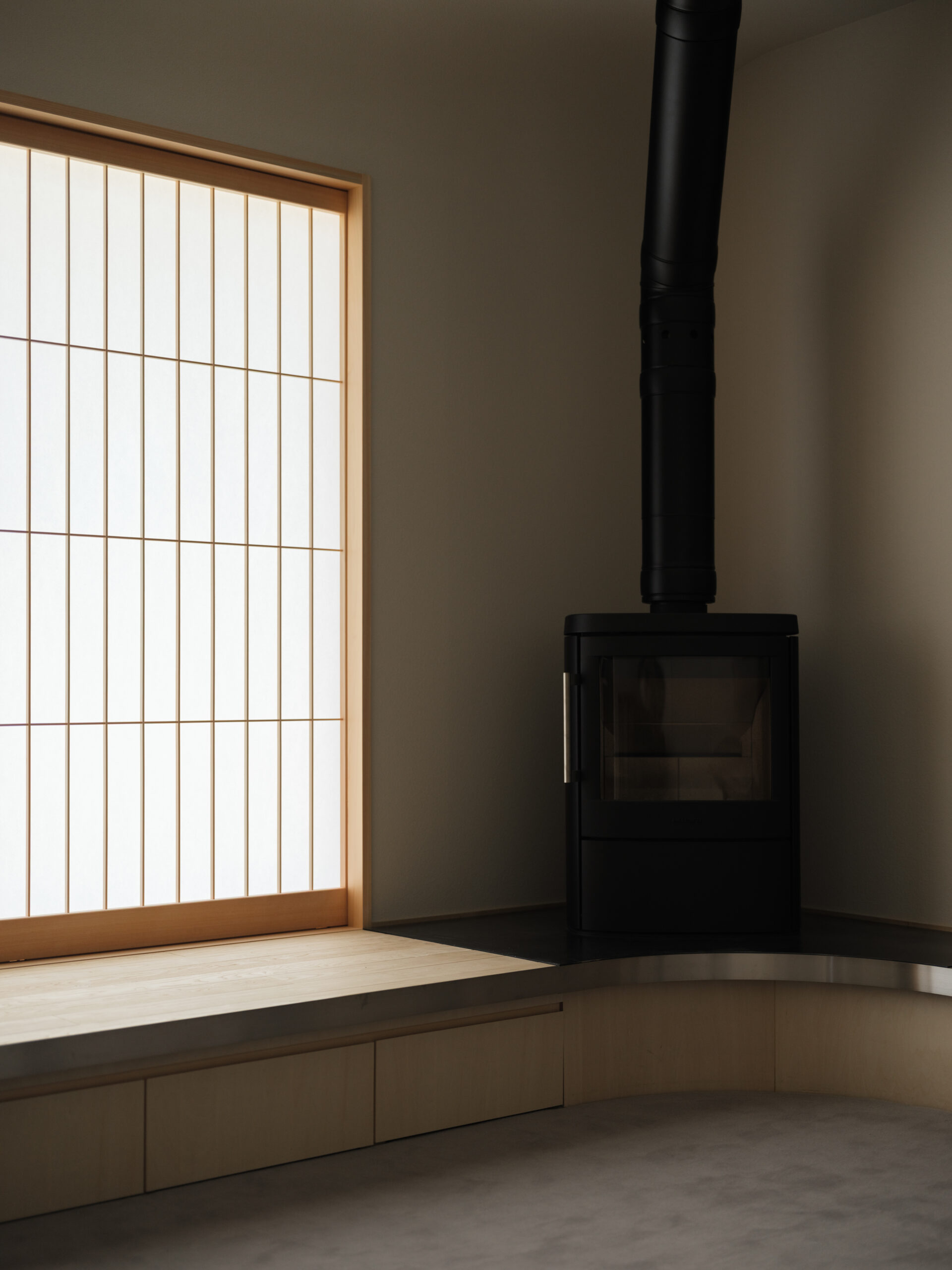 庭に面した障子からは柔らかな光が届く。桟を限界まで細くすることで静謐な空気感を作り出している。