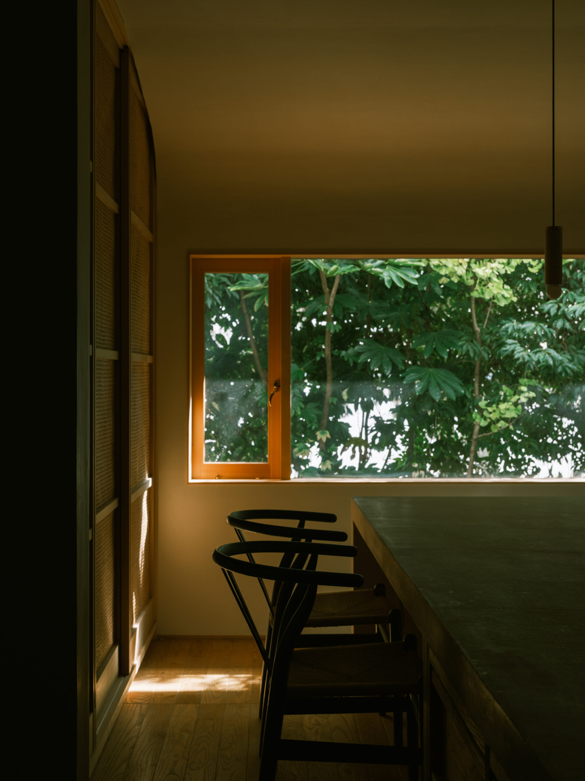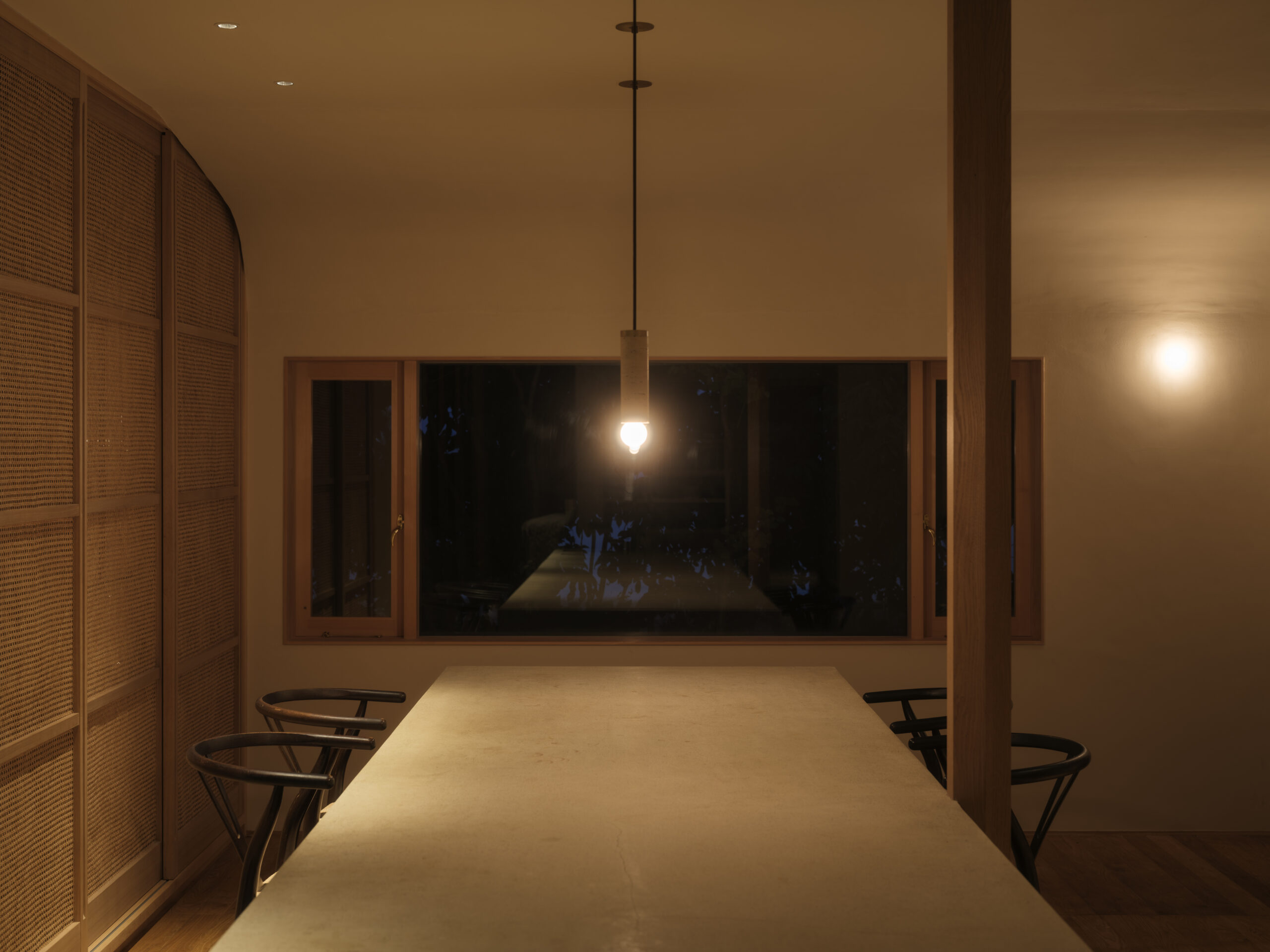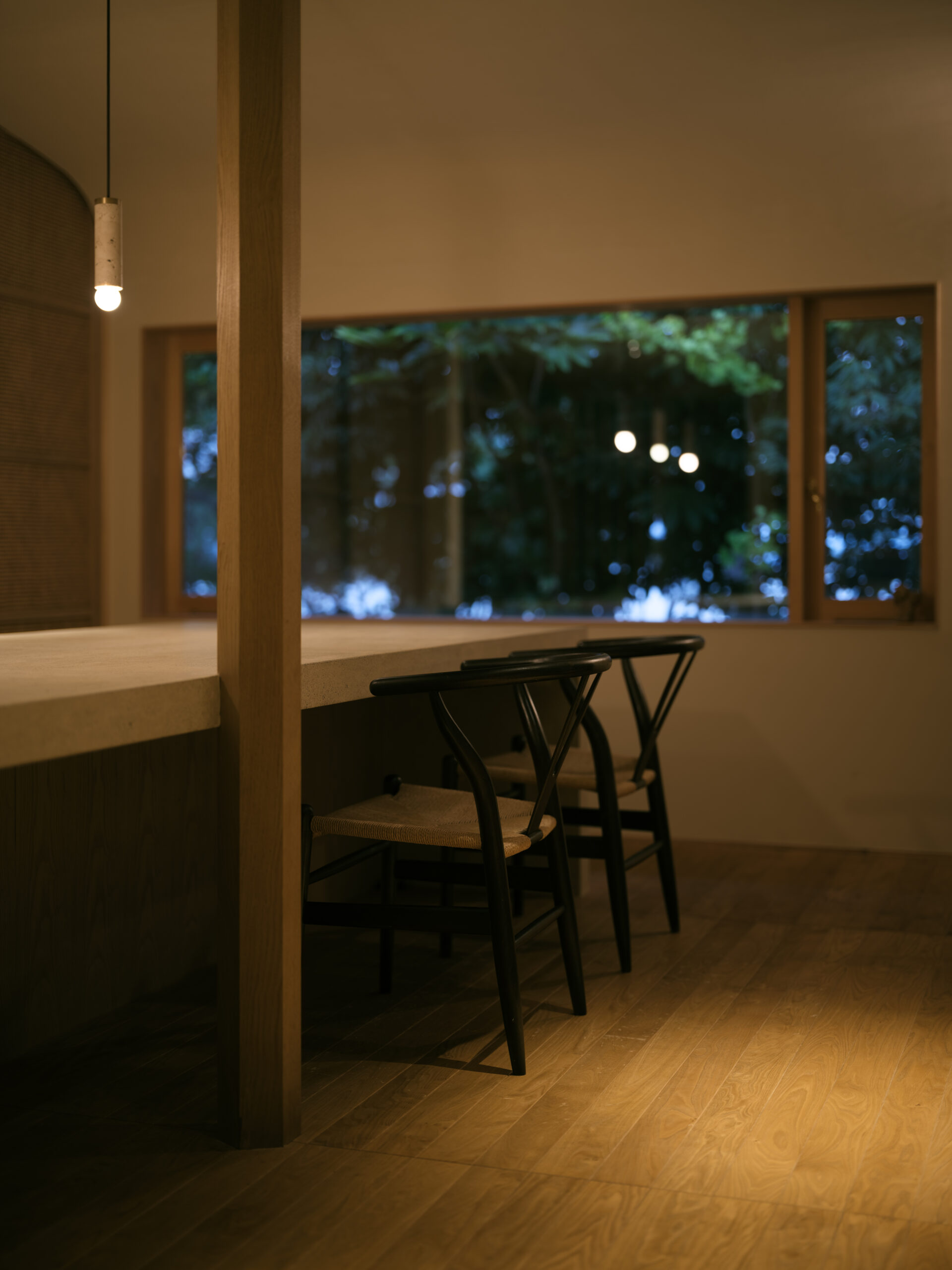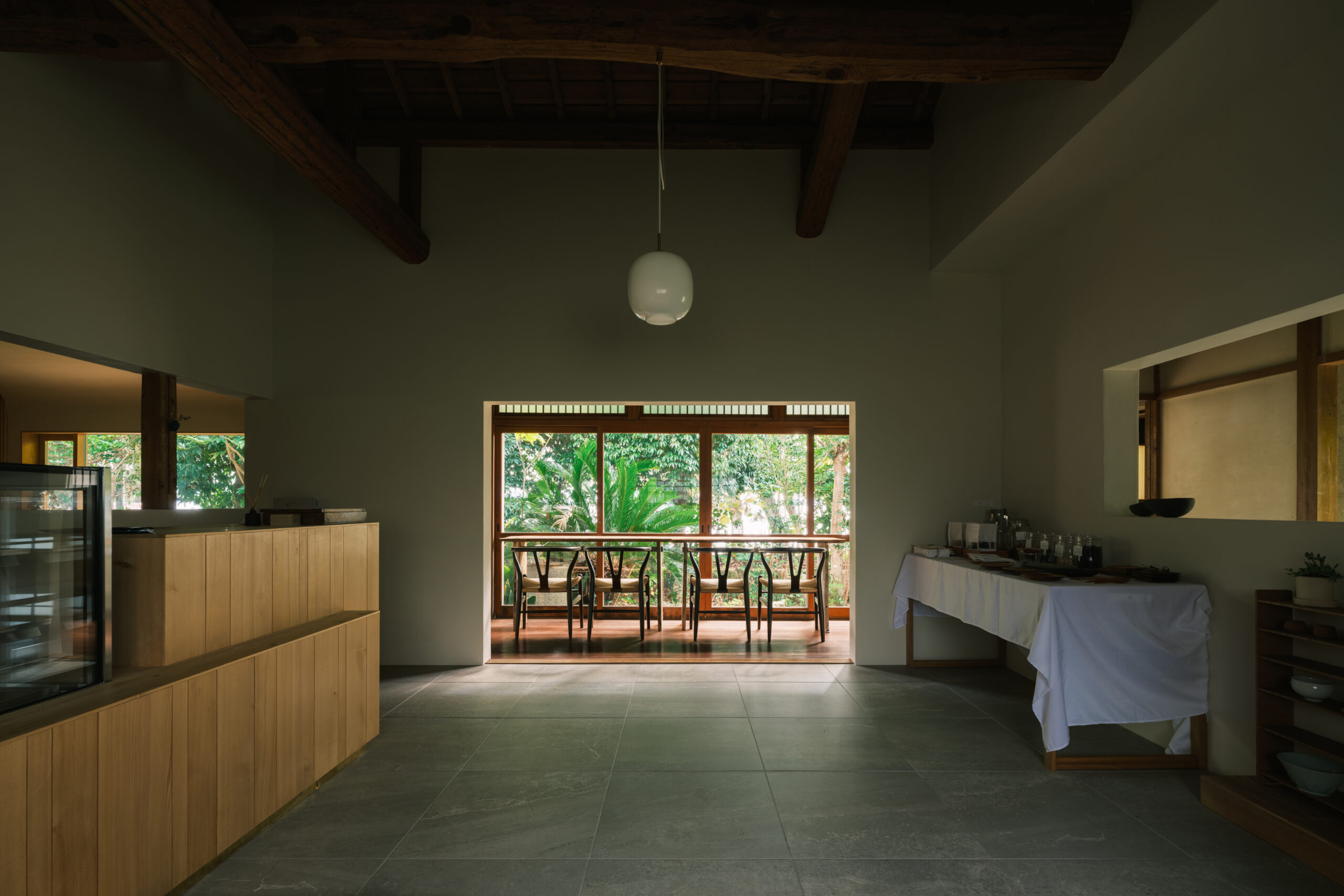 波紋の先にある、もと台所と和室だった2室を1つにして、イベント時に大人数が囲めるような5メートルある大テーブルをモルタルの研ぎ出しでつくった。窓からは湖面の反射光が木々の合間を抜け、揺らめきながら入ってくる。