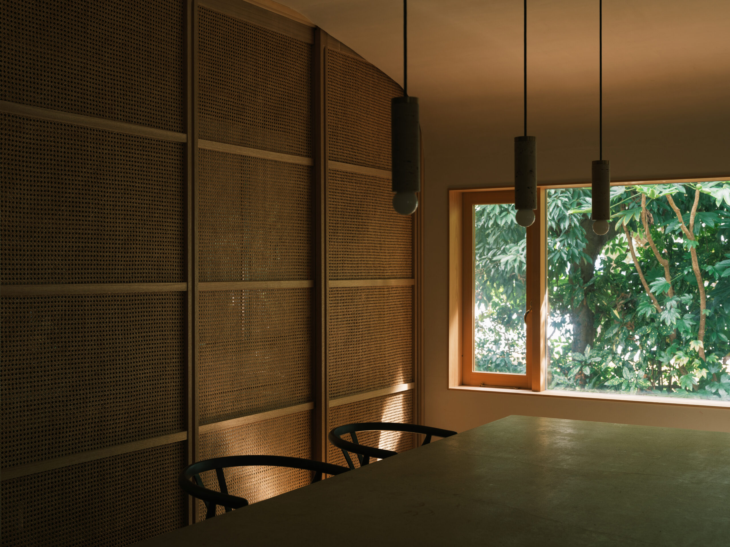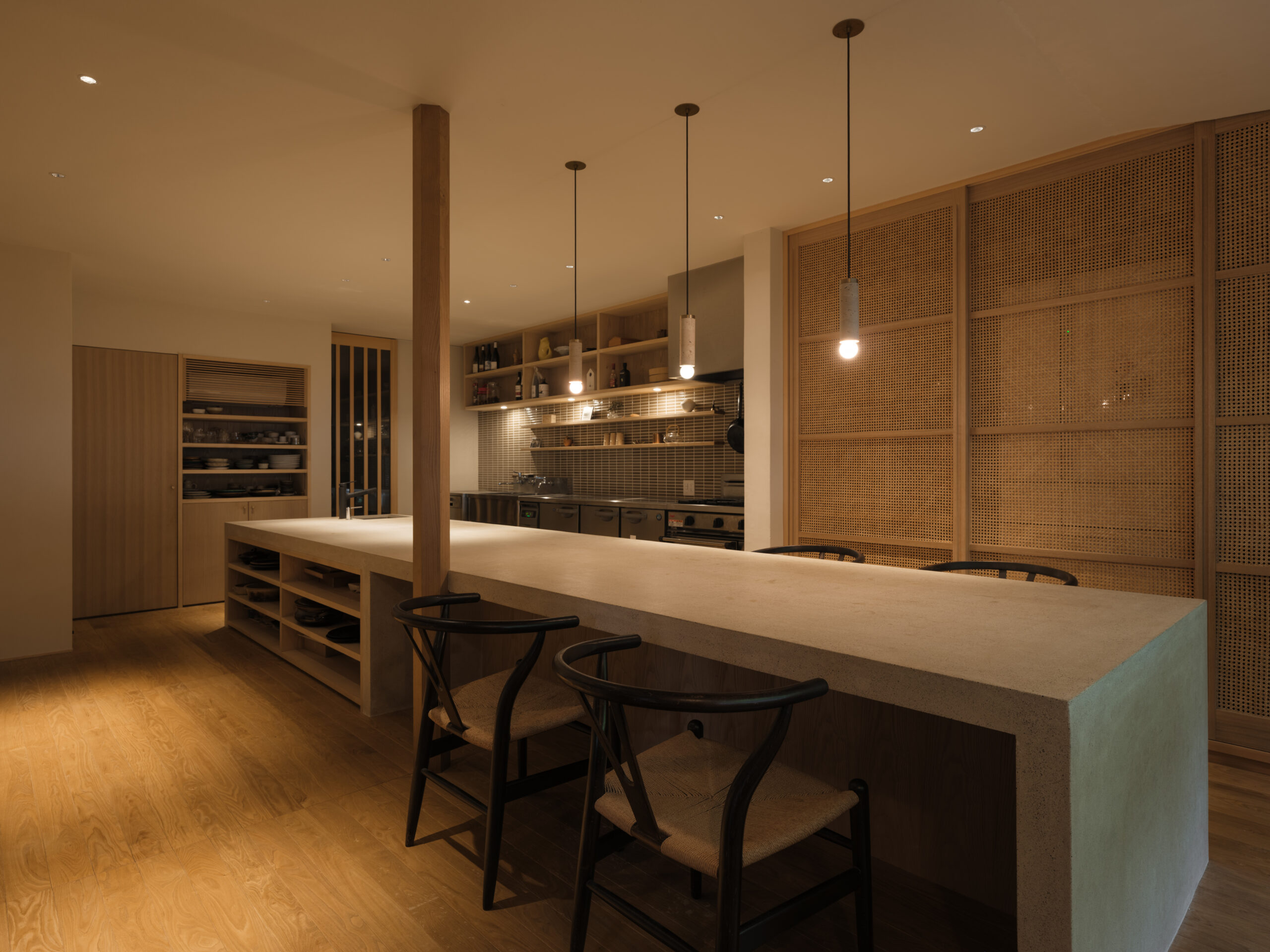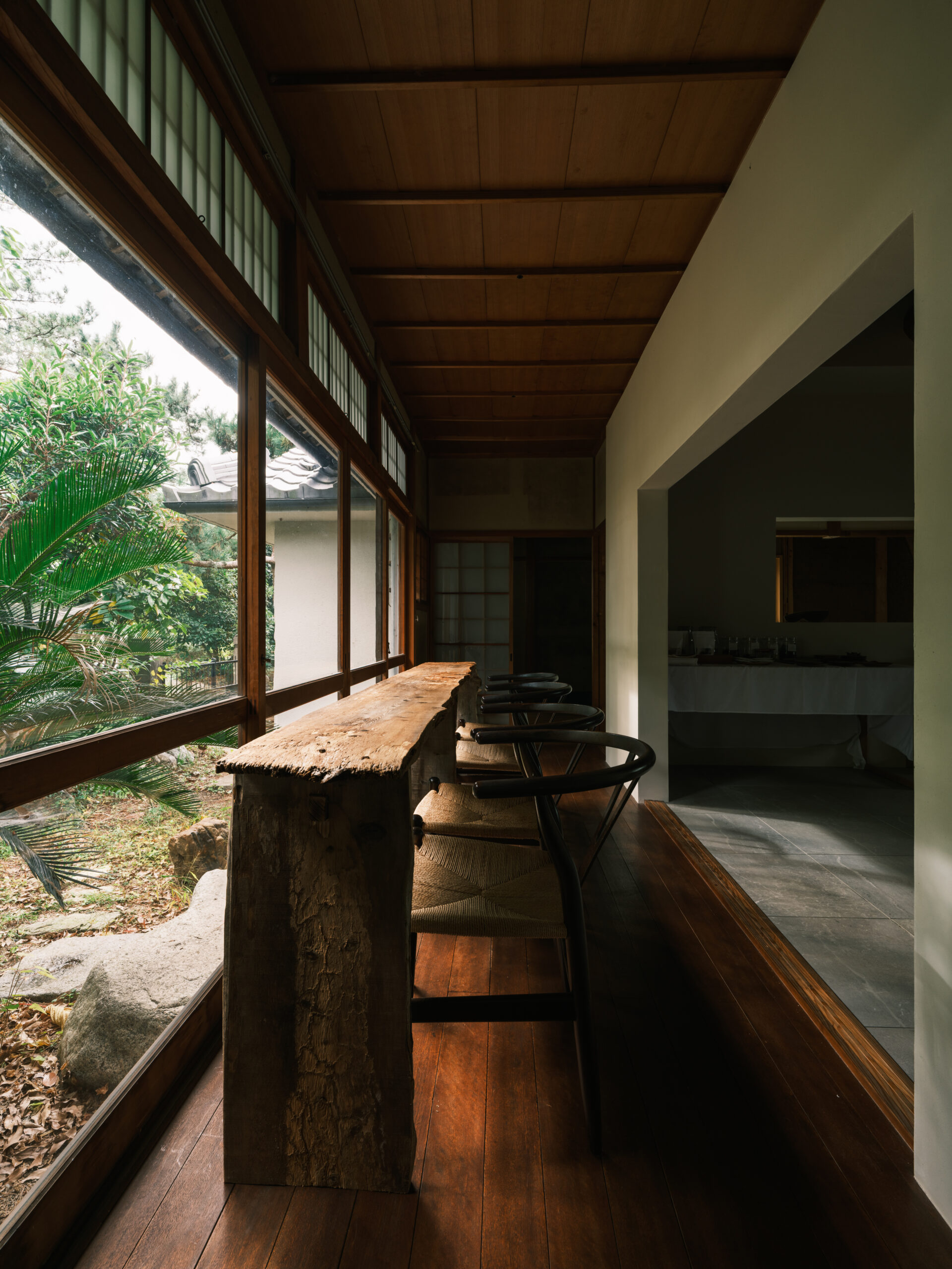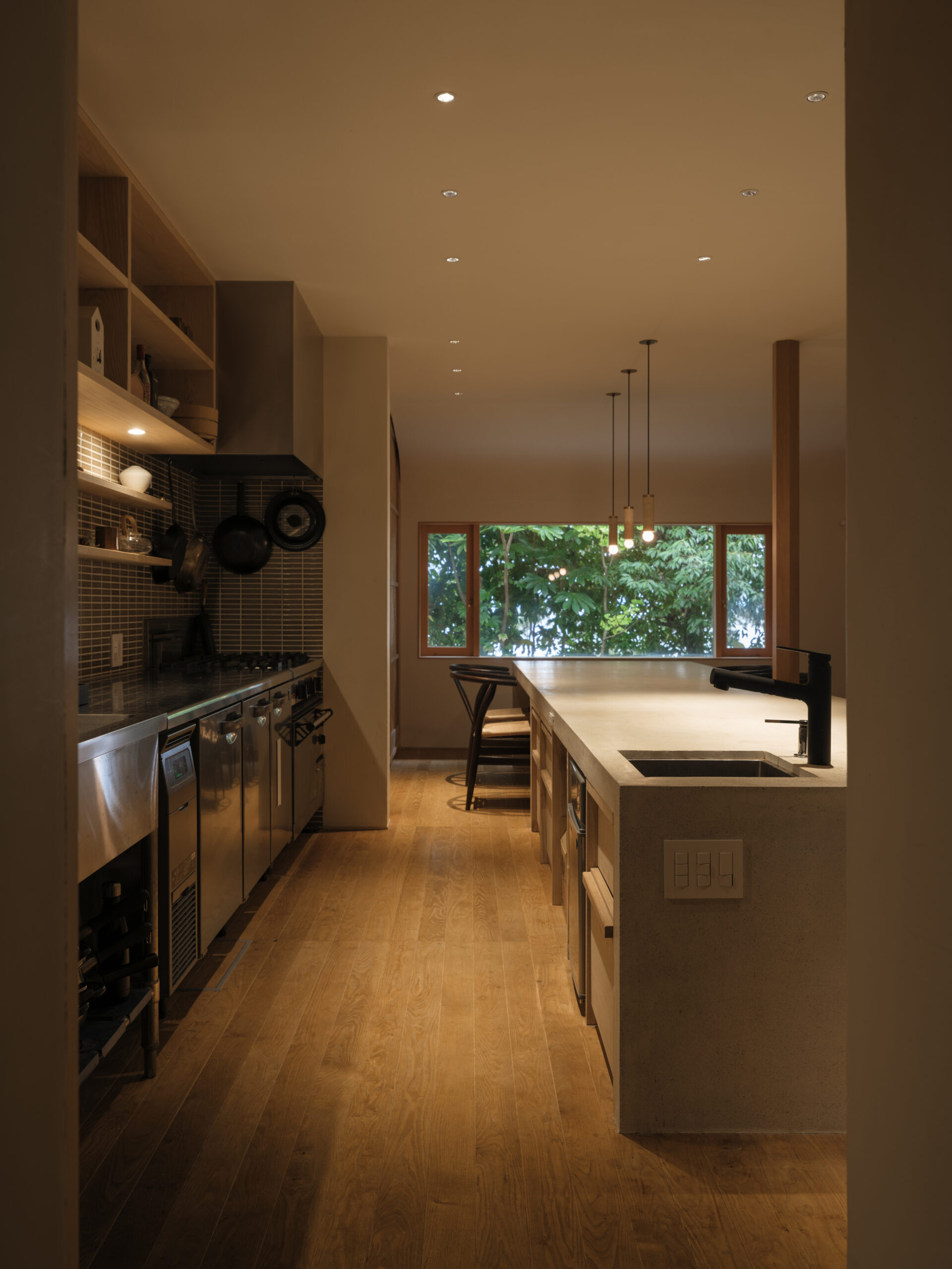 波紋の先にある、もと台所と和室だった2室を1つにして、イベント時に大人数が囲めるような5メートルある大テーブルをモルタルの研ぎ出しでつくった。窓からは湖面の反射光が木々の合間を抜け、揺らめきながら入ってくる。