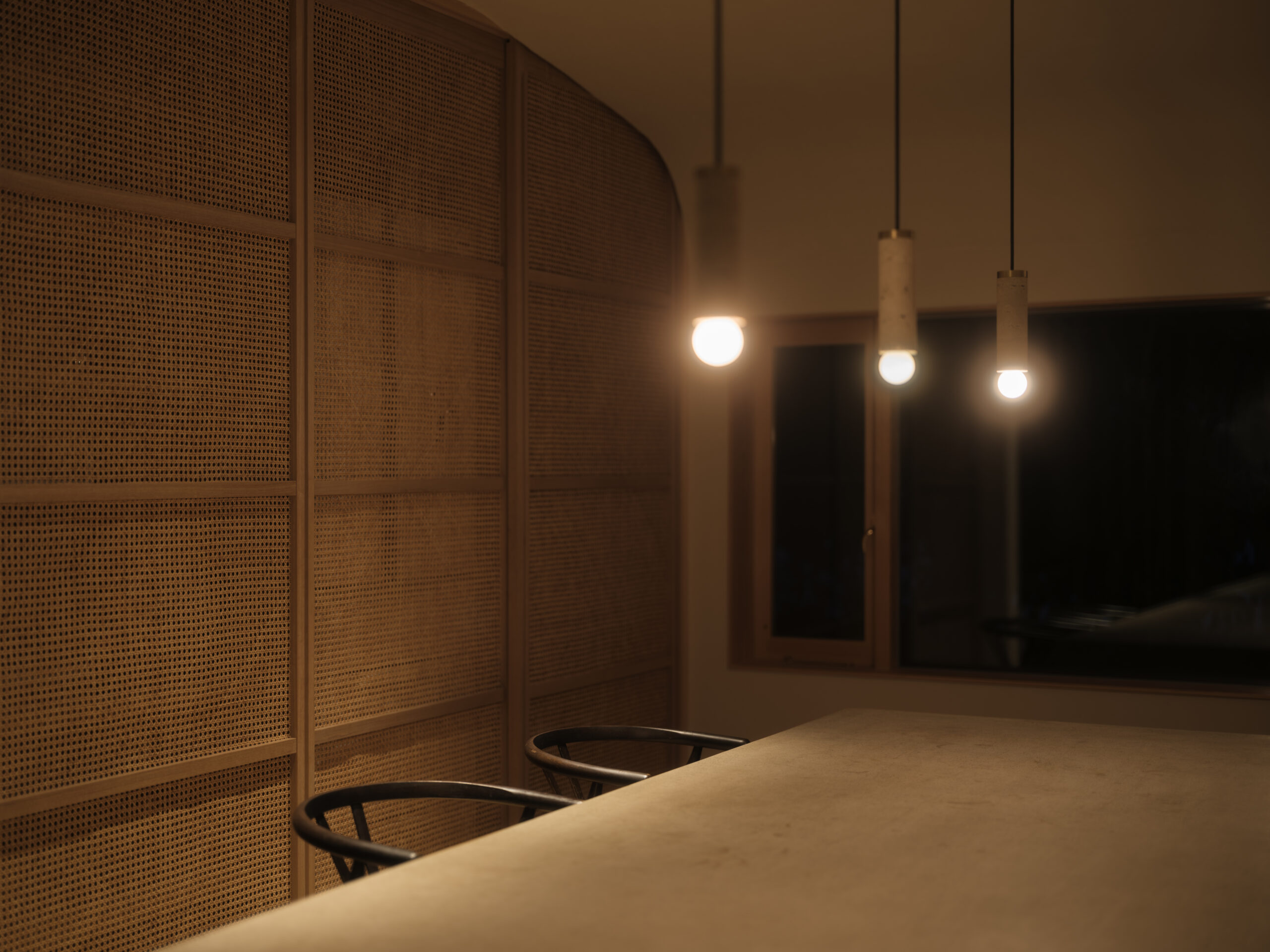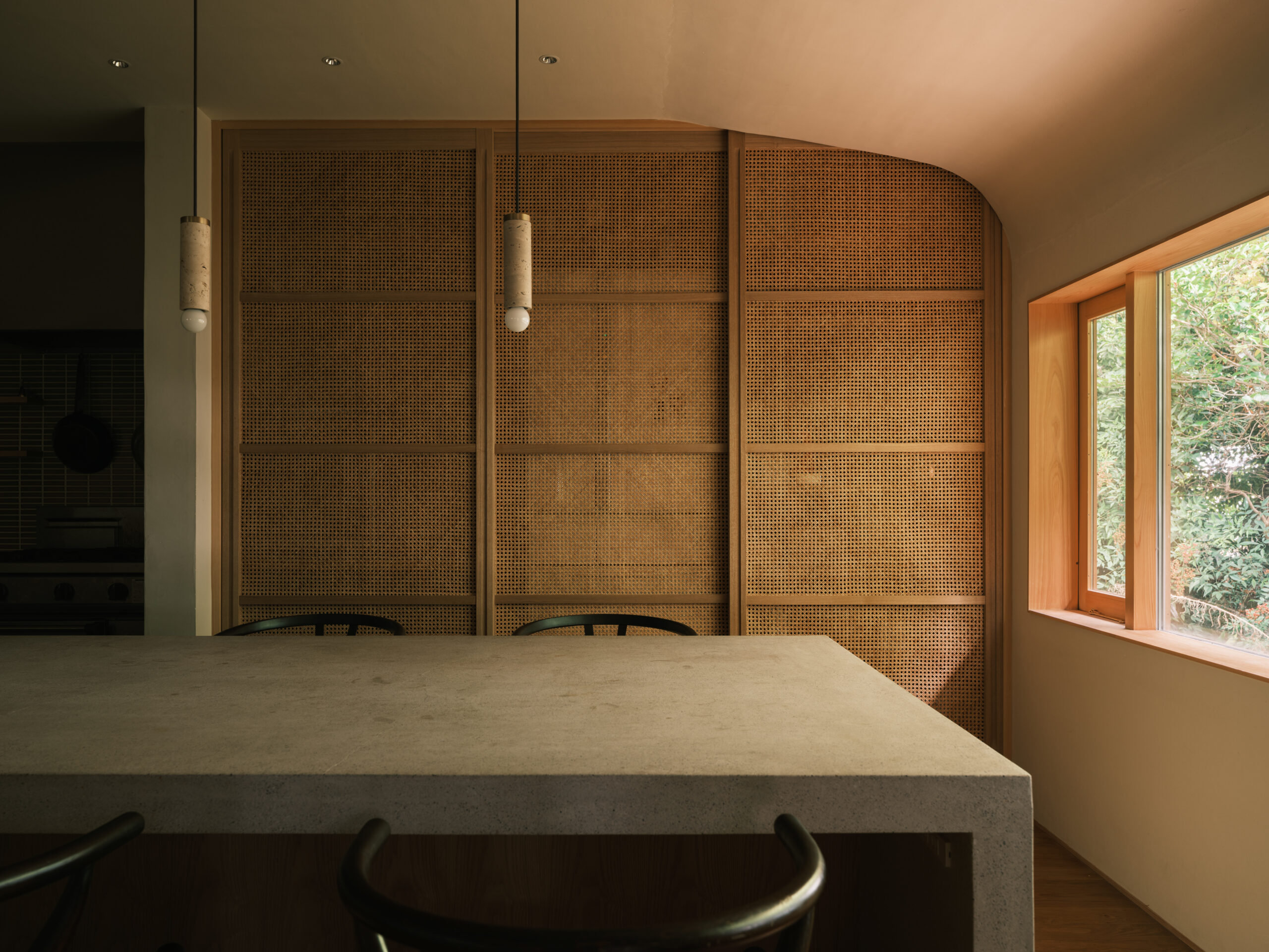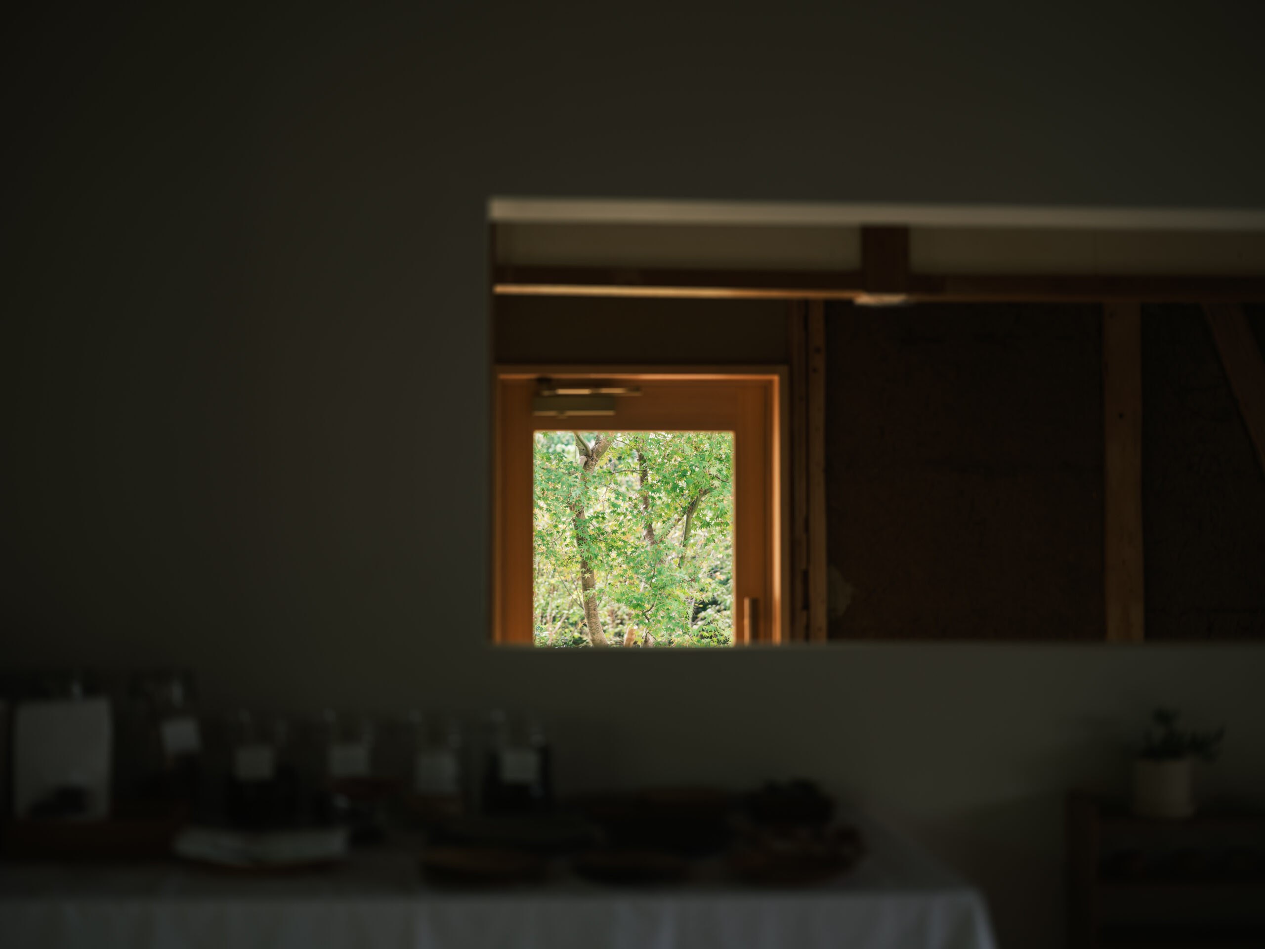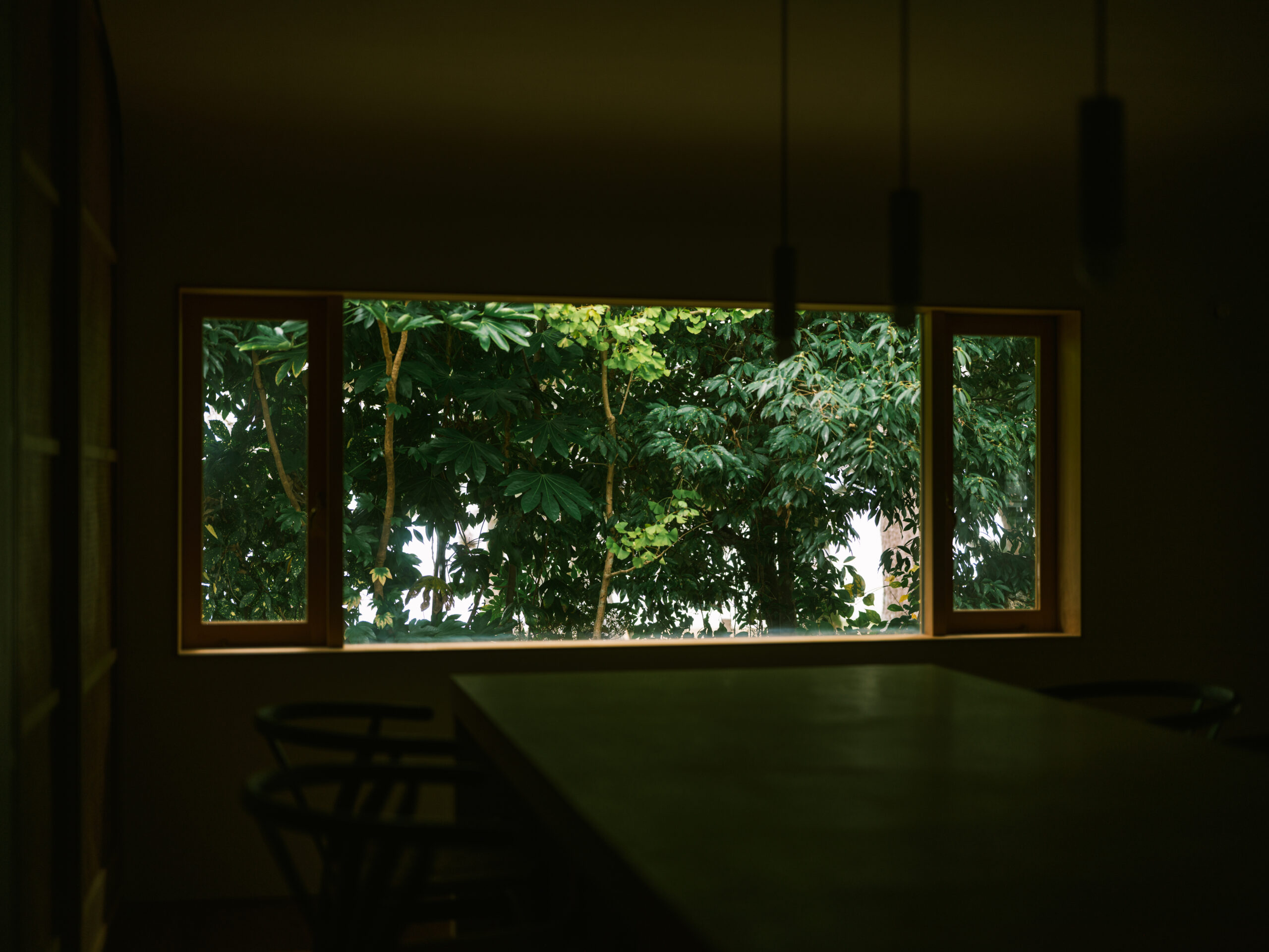 波紋の先にある、もと台所と和室だった2室を1つにして、イベント時に大人数が囲めるような5メートルある大テーブルをモルタルの研ぎ出しでつくった。窓からは湖面の反射光が木々の合間を抜け、揺らめきながら入ってくる。