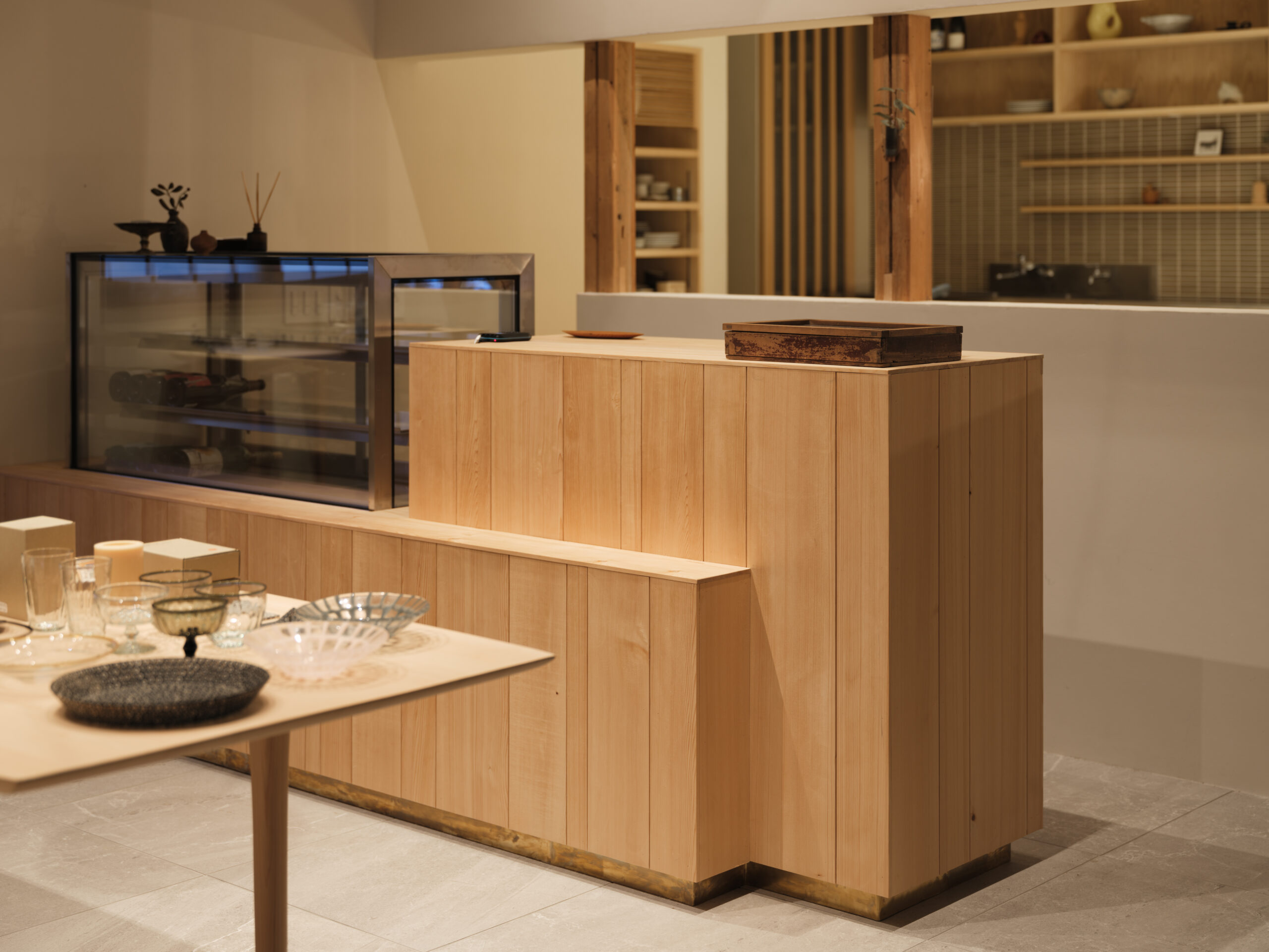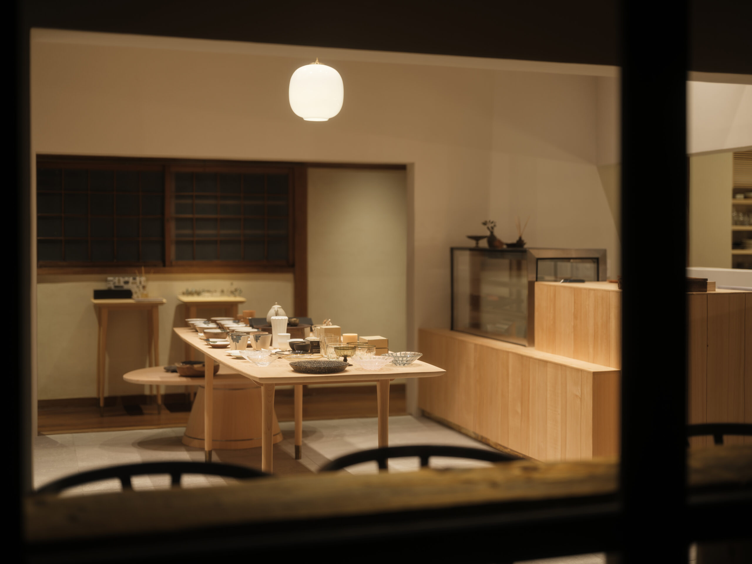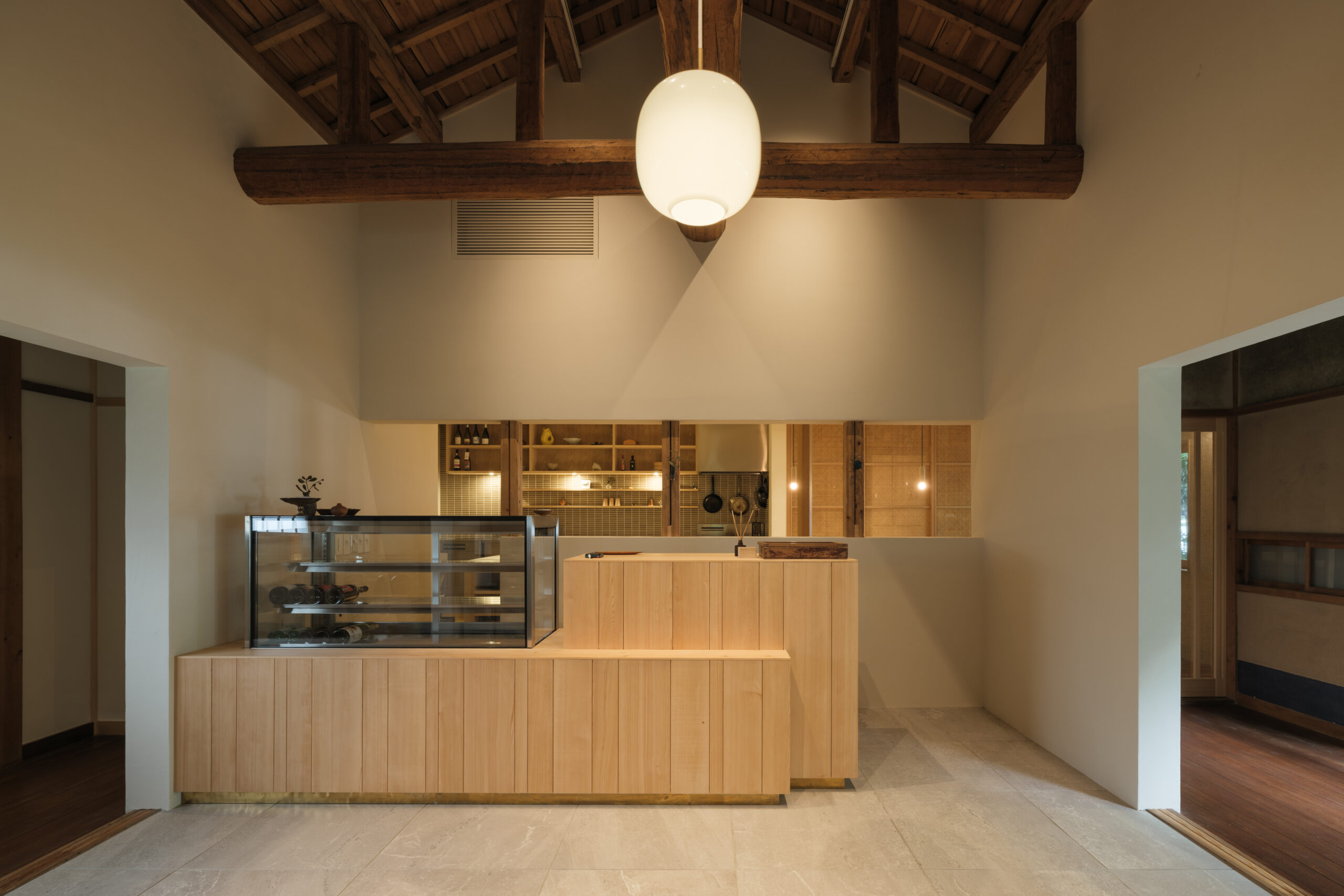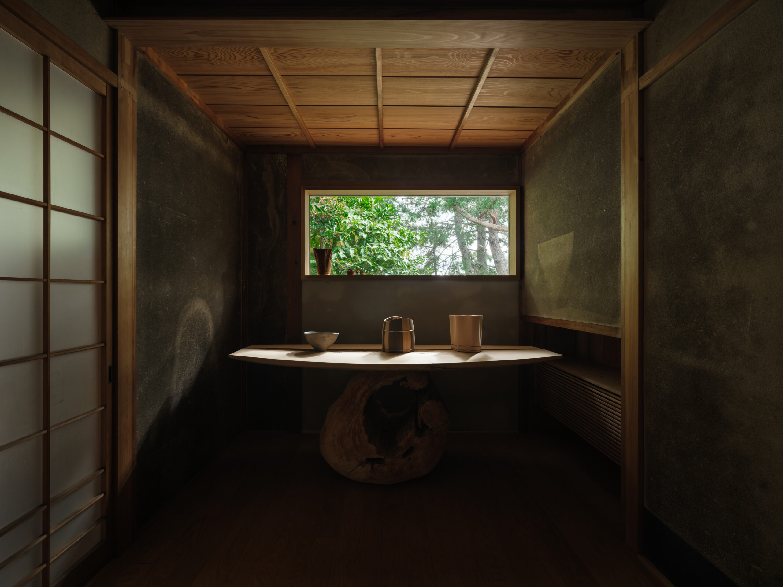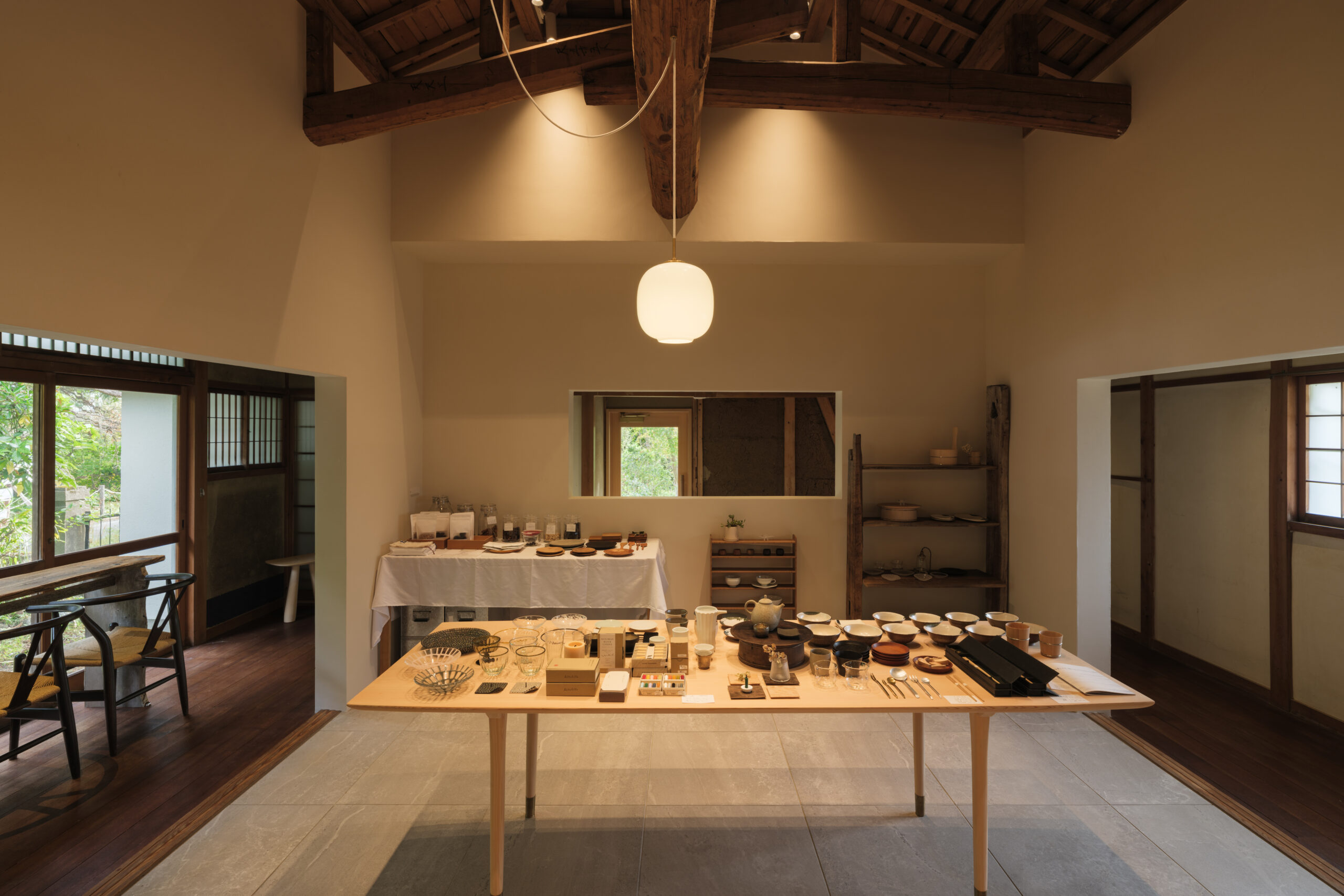 室町時代から続く伝統的な桶づくりを中心に、職人による手作りの木製品を制作し、歴史ある木工技術を継承しながらも、革新的な作品づくりも積極的に取り入れている中川木工芸による、食とクラフトのセレクトショップで、琵琶湖岸に建つ日本家屋をコンバージョンした「草庭」のデザインである。