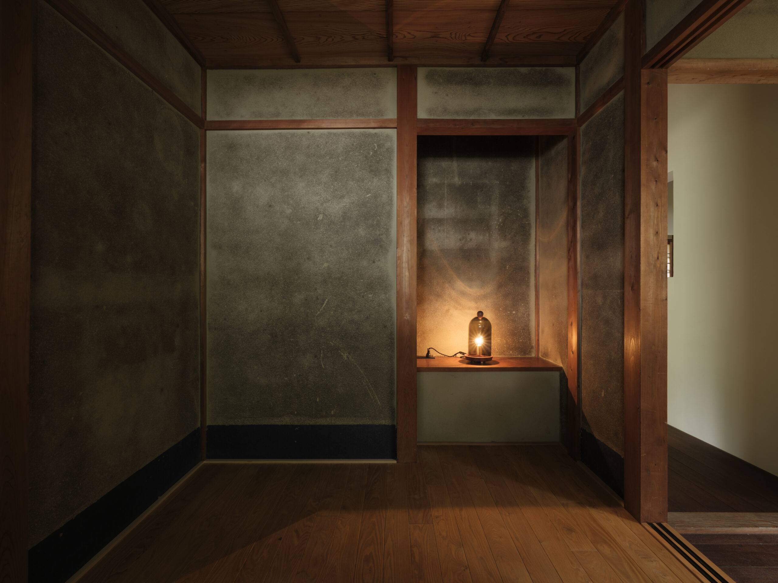 かつての住居玄関であった部分は琵琶湖をのぞめる落ち着いた個室として、木工芸の商談にも使えるような計画とした。